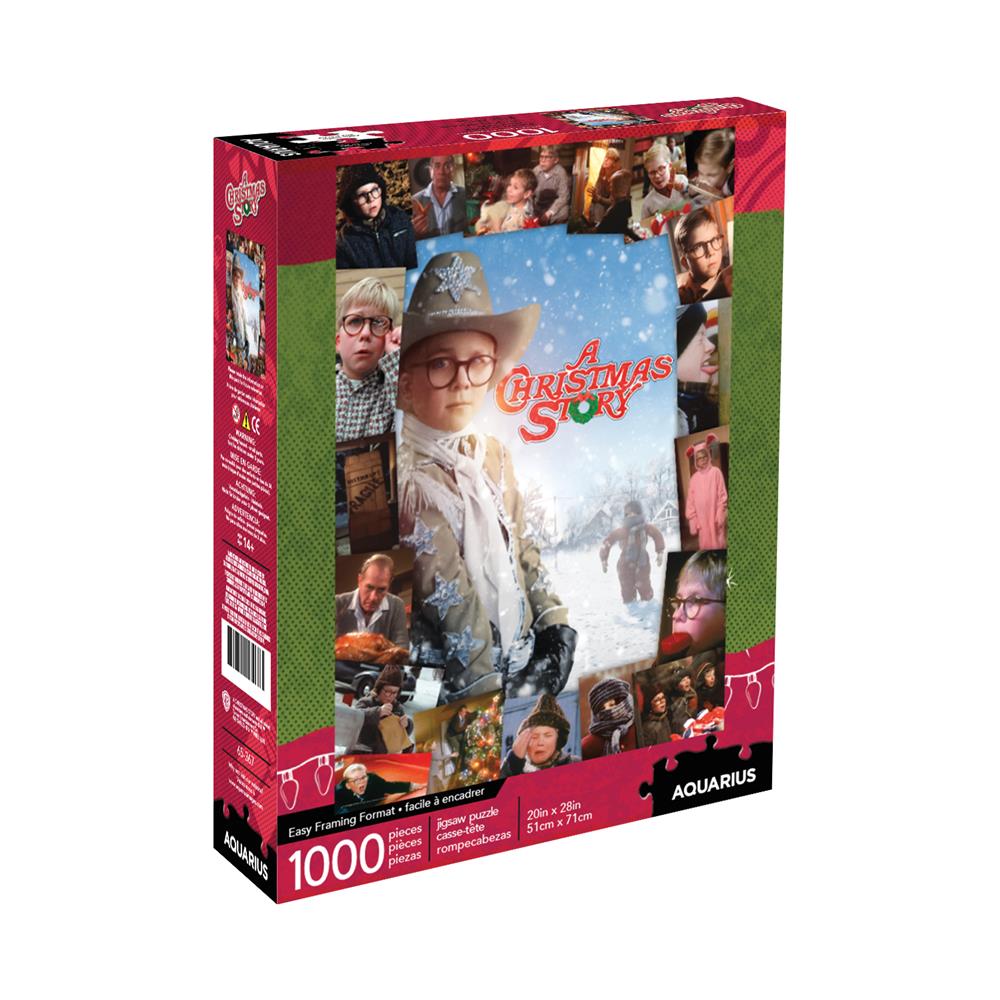 A Christmas Story themed micro jigsaw puzzle in a tube, featuring an image of Ralphie with glasses in front of a Christmas tree, with packaging displaying the same image and product details.Christmas Story Micro 150 Piece Puzzle
