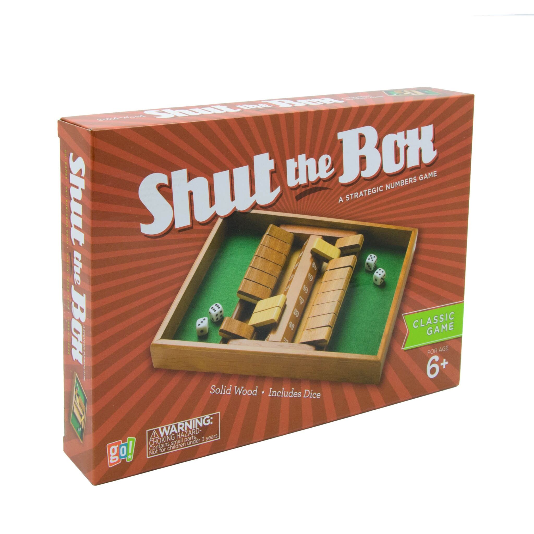 A Shut the Box game set with a wooden board, dice, and a green felt surface, packaged in a box with the game's name and age recommendation visible.Shut the Box Game - Calendar Club Canada