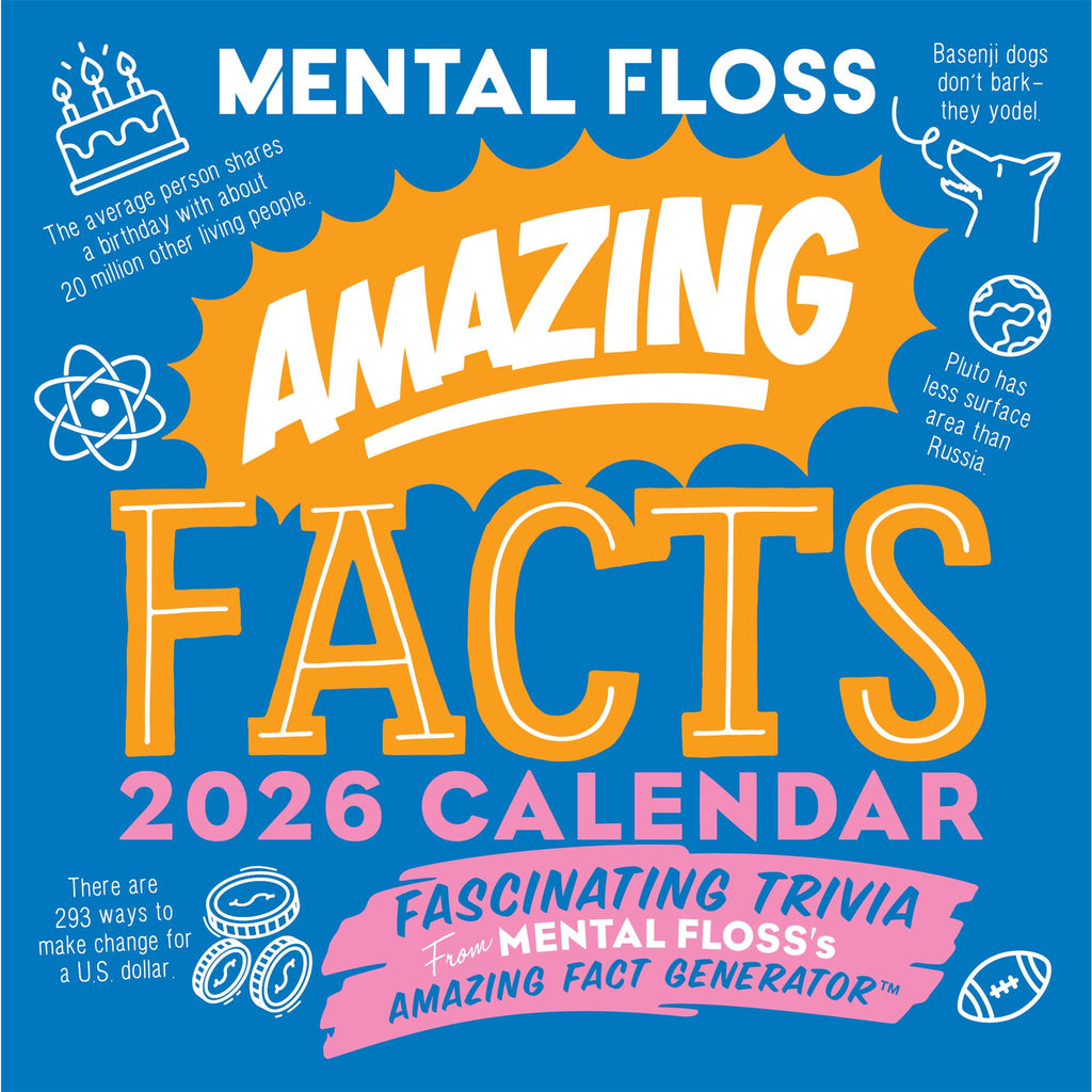 The new and incredible, odd, funny, and above all factual things you'll learn in the Amazing Facts from Mental Floss 2026 Day-to-Day Calendar are sure to inspire fascinating conversations, feverish internet deep dives, and possibly opening a book! You could be a completely different person in only a year. Isn't that amazing? Features include: No single-use plastic. Page size 4.6 x 4.6 in. Recyclable chipboard easel backer for desk or tabletop display. Printed on FSC® certified paper with soy-based ink. Full-color tear-off pages. Back of pages are blank for notes or shopping lists. Day/Date reference on each page. Combined weekend pages. Official major world holidays and observances. Featuring over 300 new too-weird-not-to-be-true points of history, pop culture, science, sports, and more from Mental Floss's Amazing Facts Generator.