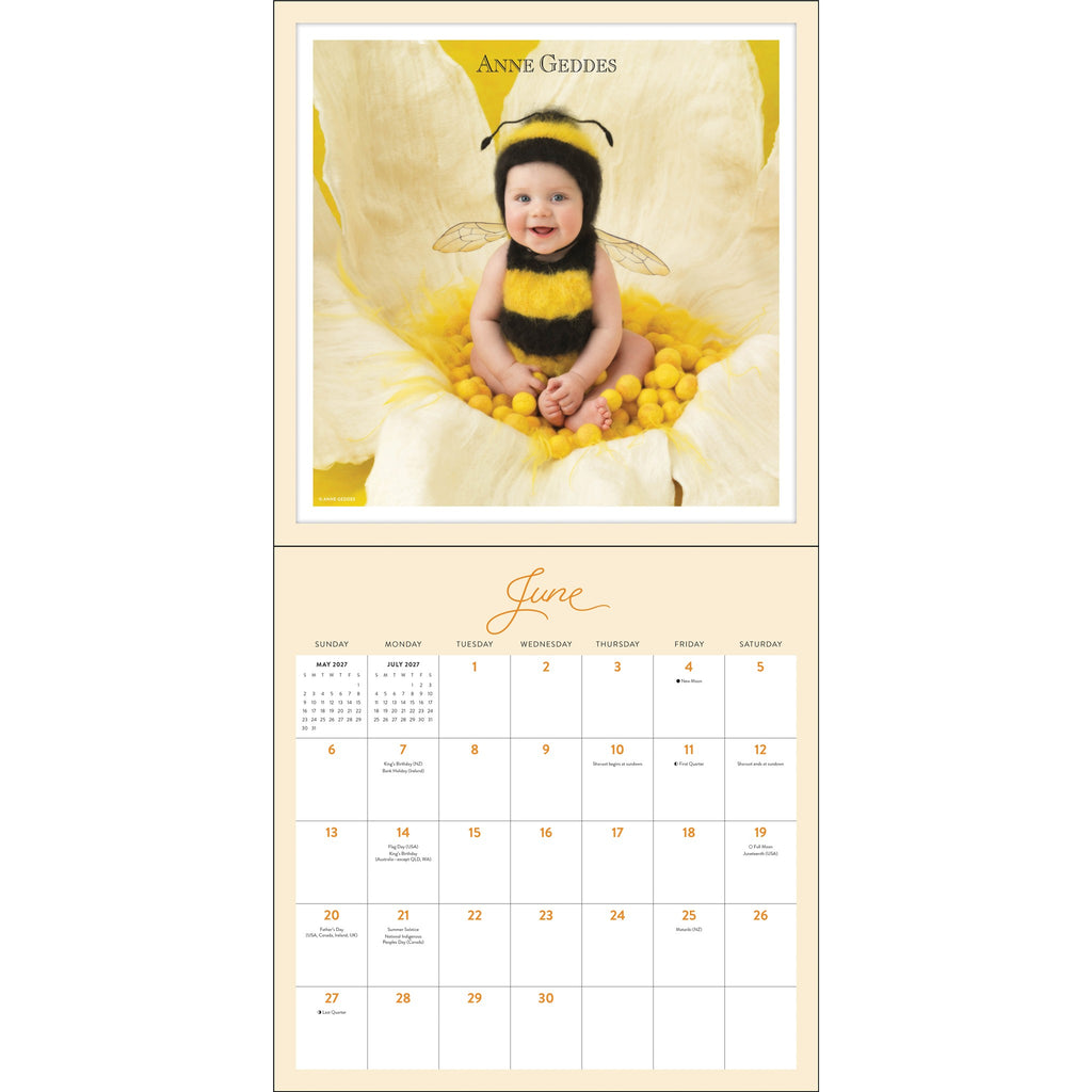 Dimensions (closed): 12"H x 12"WDimensions (open): 24"H x 12"WCalendar Format: Stapled with Medium Square GridsCalendar Start Date: January 2027 Sunday Week StartTime Span: 12 month full page gridPaper Source: FSCInk Type: Soy-BasedPackaging: Plastic Free - Single Wafer SealCreative Artist: Anne Geddes Additional Features: