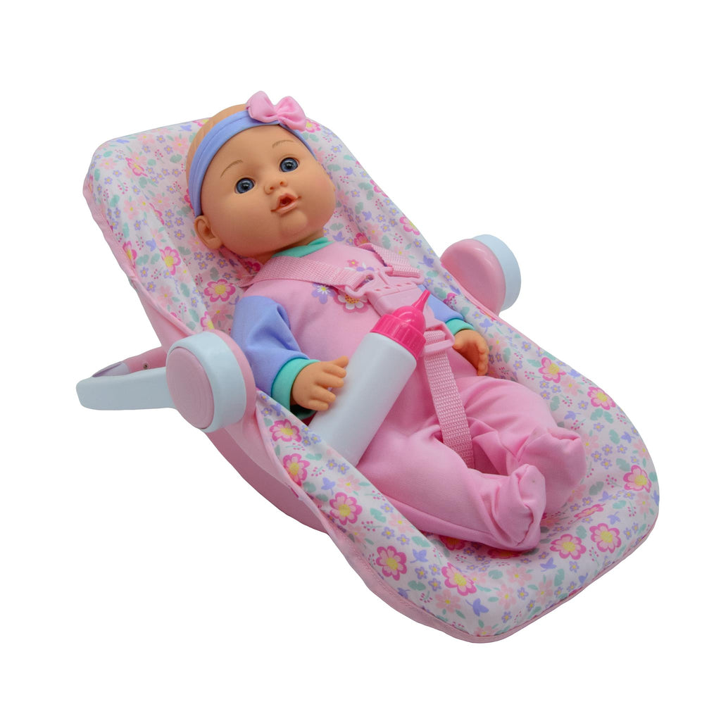 16in Baby in a Carrier Seat. 2 assorted outfit styles. Soft body with Plastic Carrier. Each sold separately, outfit selected at random.