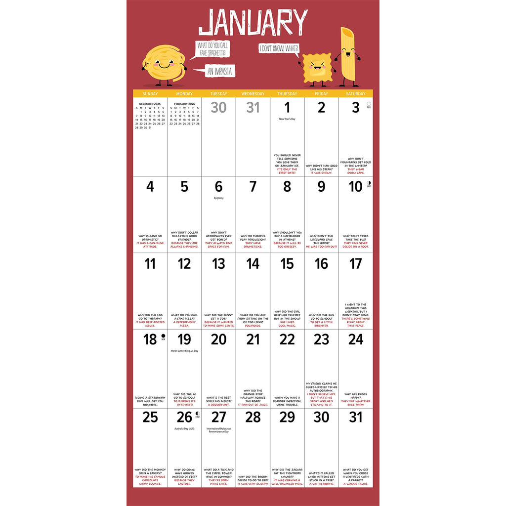 The dad joke is a delicate thing. Part knowing humor, part lack of humor, its only requirement is that it elicits not a laugh from its audience but the annoyed response: ""Daaaaaaaaad."" Bad Dad Jokes wall calendar is a collection of ""so bad they're actually good"" jokes that are guaranteed to deliver a daily dose of groans and giggles all year long. Stay organized in the upcoming year with a Willow Creek Press 2026 12"" x 12"" Wall Calendar. This calendar features large grids for easy notation of dates and events, helping you stay efficient and on top of your commitments. Let this calendar guide you to a more organized, successful and fulfilled year ahead. PERFECT GIFT - Look no further for the perfect gift for any special occasion. Make someone's year extra special with one of our 2026 Wall Calendars. Our calendars are the perfect choice for your friends or family, even for those difficult to buy for. PLANNING - Stay organized and inspired throughout the year. Ideal calendar for taking notes, recording dates to remember, tracking appointments and assisting in family activity organization. INCREDIBLE IMAGES - Crisp, detailed full-color images every month providing Wall art for Home, Office or School. LARGE GRIDS - 12" x 12" format, with large daily blocks providing ample writing room. SUPERIOR QUALITY - High quality paper stock that lays flat when hanging and offers crisp, bright colors. MONTHLY OVERVIEW - Plan ahead or look back with grids of the upcoming and previous months at a glance. ECO FRIENDLY - Willow Creek Press is committed to eco-friendly efforts to make our products more sustainable, our 2026 12" x 12" wall calendars are printed with soy-based inks on high-quality FSC certified paper for smooth writing. DATE RANGE - 2026 Wall Calendar with 6 bonus months from July-December 2025. BONUS FEATURES -US and International holidays and moon phases (CST) noted on each month for easy tracking. This year can be your most successful yet, with this beautiful and brilliant wall calendar.