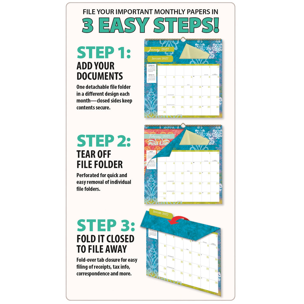 The WSBL Bohemian 2027 File-It™ is a calendar and filing system all in one! Record your engagements on the spacious calendar grid and store your documents in the built-in file folder for each month! A "Notes" section on the back lets you label the contents. In addition, the entire calendar is decorated with elements by artist Susan Winget!