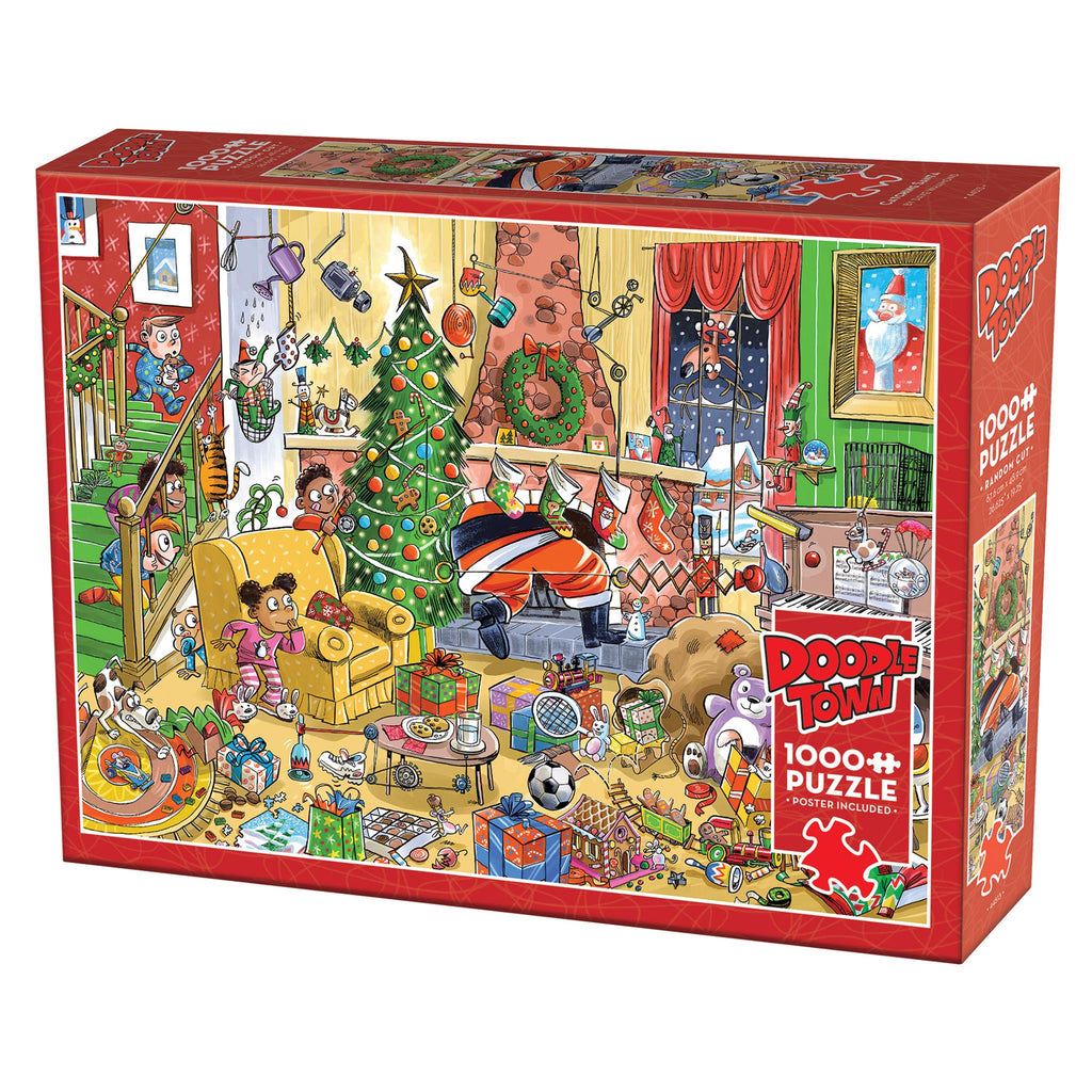 Santa finds himself in a tight spot! He’s just come down the chimney, but before he can even grab his milk and cookies, he's scrambling to make a quick getaway, leaving his sack behind as curious kids catch him in action. Even a reindeer peeks through the window, eager to see the commotion! This 1,000 piece puzzle by award-winning cartoonist Dave Whamond is packed with humour and holiday cheer. Cobble Hill puzzles feature interesting random-shaped pieces, so no two pieces are alike. Includes a handy poster.
