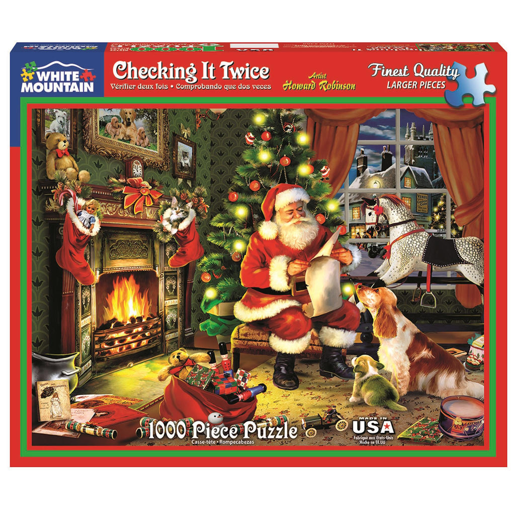 The delightful "Checking It Twice" puzzle from White Mountain Puzzles serves as both a thoughtful gift and a vibrant seasonal adornment. Capturing the festive spirit, it depicts Santa Claus amidst a cozy scene, with stockings adorning the fireplace and excited gazes fixed upon him. In a moment of pause, Santa meticulously reviews his list, ensuring no child is forgotten before he embarks on his next journey. The puzzle, illustrated by the talented Howard Robinson, portrays Santa with his iconic charm and warmth, making it an engaging and nostalgic experience for puzzlers of all ages. Measuring a sizable 24 inches by 30 inches when completed, the puzzle offers a satisfying challenge and a visually stunning display once assembled. Its large size makes it suitable for framing or displaying as a centerpiece during the holiday season, adding a touch of festive cheer to any room. Additionally, with plenty of White Mountain Puzzles gifts still tucked away in Santa's bag, there's an extra layer of excitement as puzzlers piece together this charming scene. Whether as a gift for puzzle enthusiasts or as a delightful addition to your own seasonal decor, "Checking It Twice" promises hours of enjoyment and a timeless celebration of the magic of Christmas.