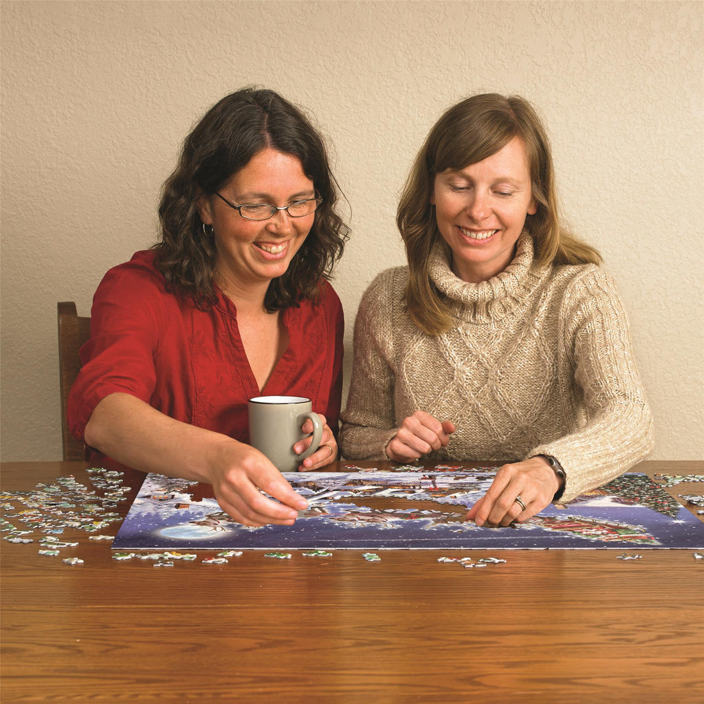 Santa guides his sleigh over the cozy sleeping village. Only the dogs are there to watch the nighttime spectacle. This 1,000 piece puzzle is filled with holiday magic. Cobble Hill puzzles feature interesting random-shaped pieces, so no two pieces are alike. Includes a handy poster.