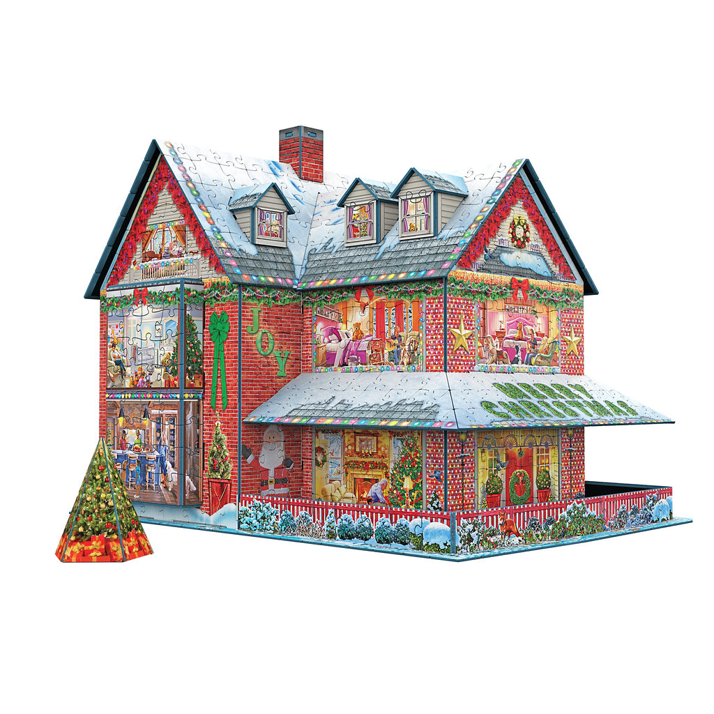 Christmas House 3D Puzzle 1100 Pieces is the perfect holiday activity for friends and family. This 3D House maintains the nostalgic charm and tactile pleasure of a traditional jigsaw puzzle through the use of blue board and interlocking 2 dimensional puzzles. Immersive Build: Each box contains 1100 puzzle pieces, with 9 different puzzle sections to assemble. Each portion is heavily detailed with fun Holiday themed artwork. Explore your way through this Christmas house one festive piece at a time! Sturdy Construction: Once each puzzle section is assembled, the pieces are secured using the provided glue sheets and support bars, then assembled into a 3D creation. Completed house dimensions 10.75 x 13.7x 10.5 inches.