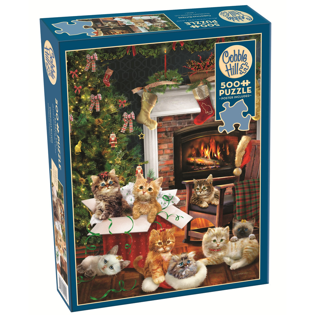 It's Christmas morning and the kittens have been up all night playing. The decorated tree has managed to stay adorned with ornaments. A couple of cuties have made their way into a box, while the other kittens lay about on the floor and chair warmed by the crackling fireplace. This 500 piece puzzle is full of holiday coziness. Cobble Hill puzzles feature interesting random-shaped pieces, so no two pieces are alike. Includes a handy poster.
