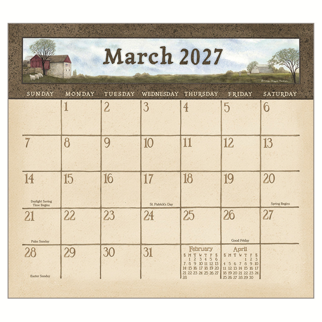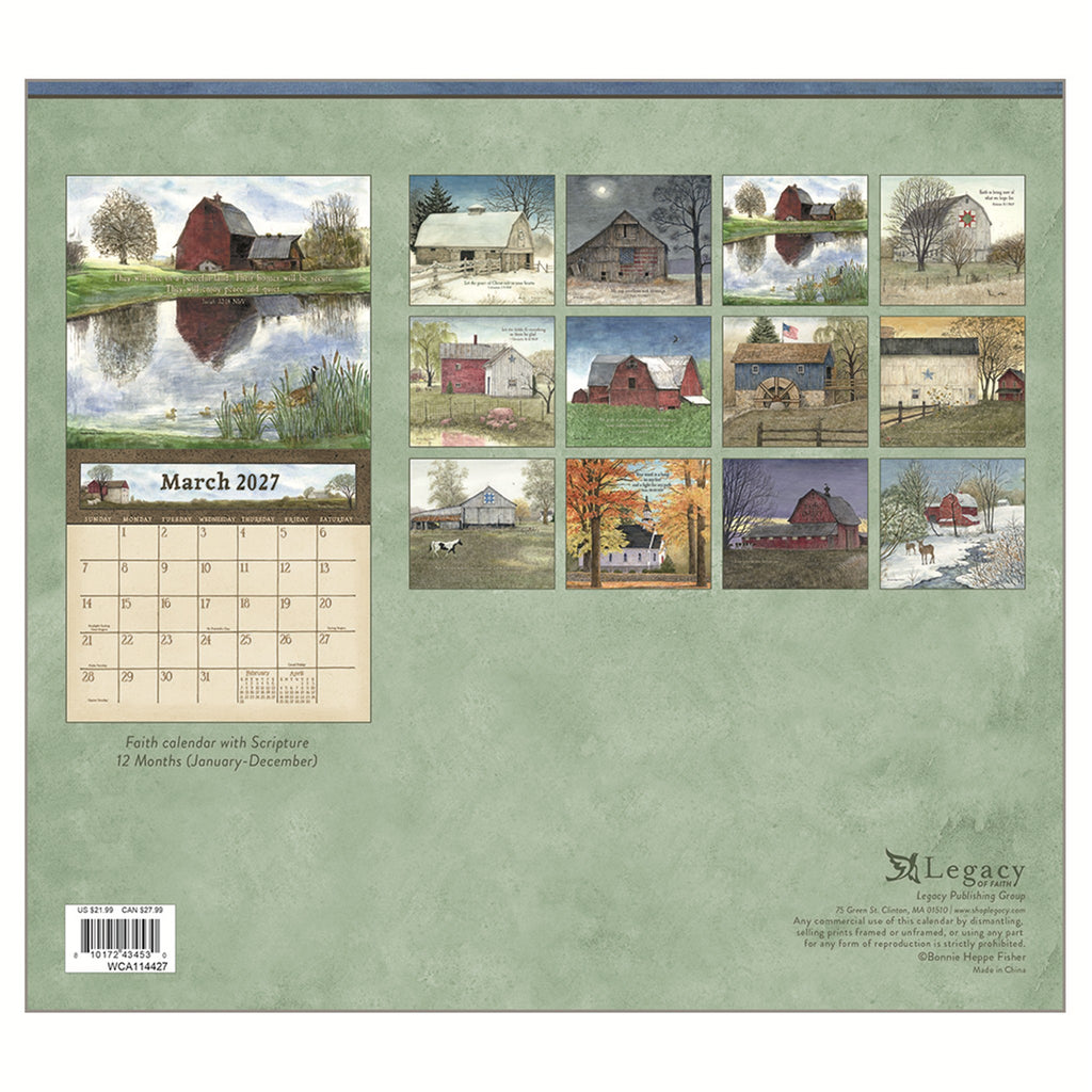 This 2027 Legacy Wall Calendar features the beautiful, barn-themed artwork of Bonnie Heppe Fisher joined with inspirational Scripture verses. Each 12-month calendar is printed on premium, linen-embossed paper that has a distinctive, luxurious feel to it, and comes in a protective sleeve. The date pad is uniquely designed for each calendar title to complement the artwork. The last page contains a 2-year calendar (2027/2028) and space for notes. Brass gusset on front cover for added durability.