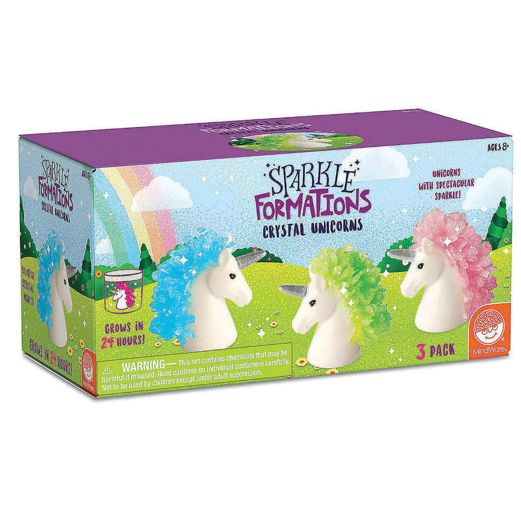 Watch as magic unfolds with Sparkle Formations Crystal Unicorns! Grow your own mystical unicorns with sparkling crystal manes overnight. This easy and fun science project comes with everything you need to witness the awe-inspiring process of crystallization. Get ready for enchantment in just 24 hours. Includes 3 unicorn molds, 3 colours of crystal powder, stirring sticks, growing container and instruction manual.