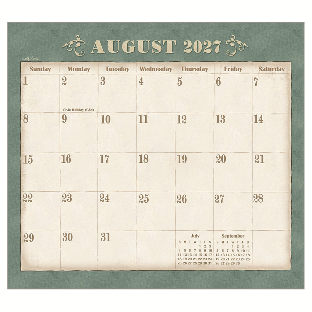 Dimensions (closed): 12.125"H x 13.375"WDimensions (open): 24"H x 13.375"WCalendar Format: Stapled with Medium Square GridsCalendar Start Date: January 2027 Sunday Week StartTime Span: 12 month full page gridPaper Source: Non-FSCInk Type: Petroleum-BasedPackaging: Plastic Free - Envelope/SleeveCreative Artist: Sueellen Ross Additional Features: