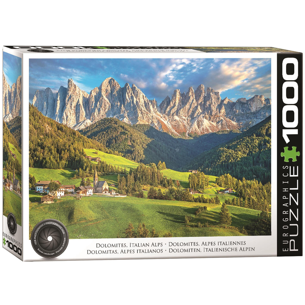 The Dolomites, also known as the Dolomite Mountains, Dolomite Alps or Dolomitic Alps, are a mountain range located in northeastern Italy. They form part of the Southern Limestone Alps and extend from the River Adige in the west to the Piave Valley in the east. This puzzle measures 19.25 x 26.6 inches completed. Made with premium European recycled blue board paper. Age graded 13+ years and older.