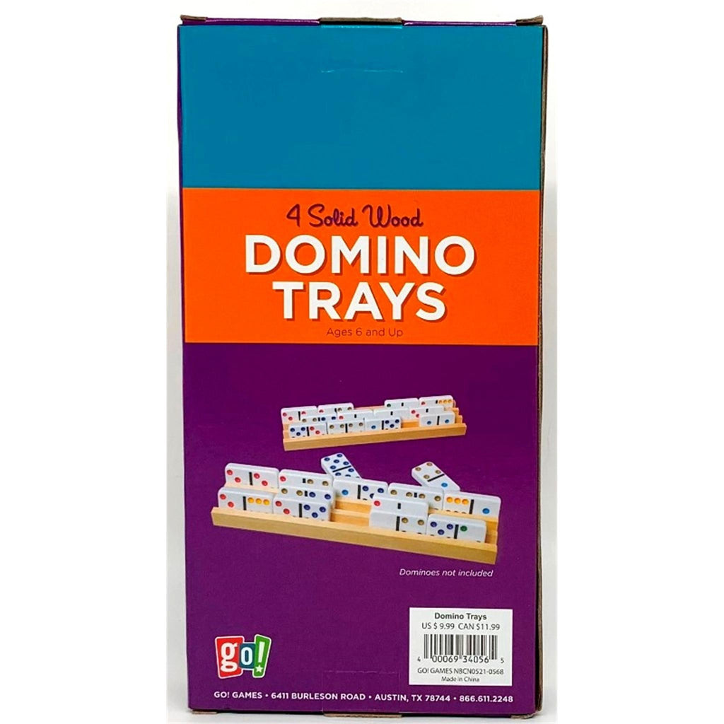 4 Solid Wood Domino Trays: This is the perfect set up for your riveting domino games. One set includes 4 solid wood trays. Each tray comes with 3 slots - hold up to 15 horizontally laid out dominoes and 30 vertically arranged ones. Dominoes not included.