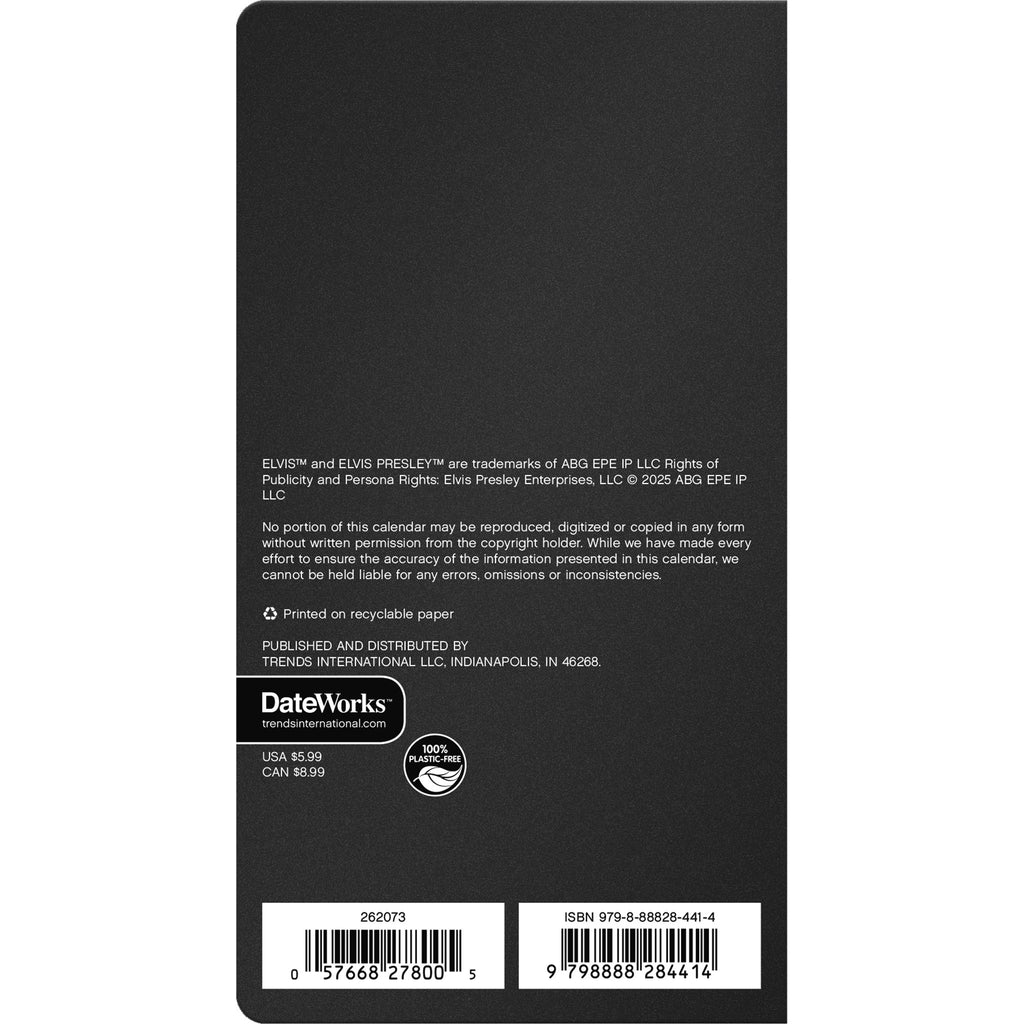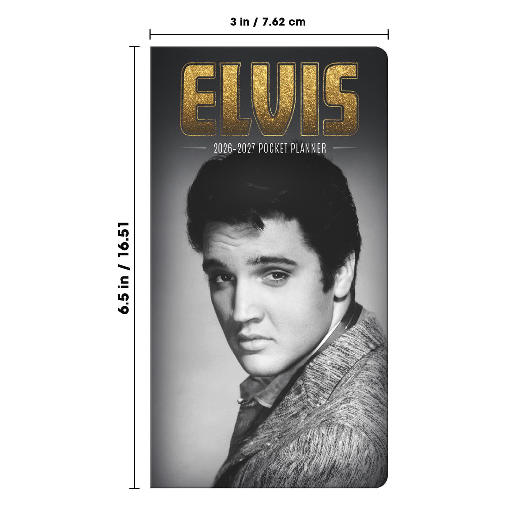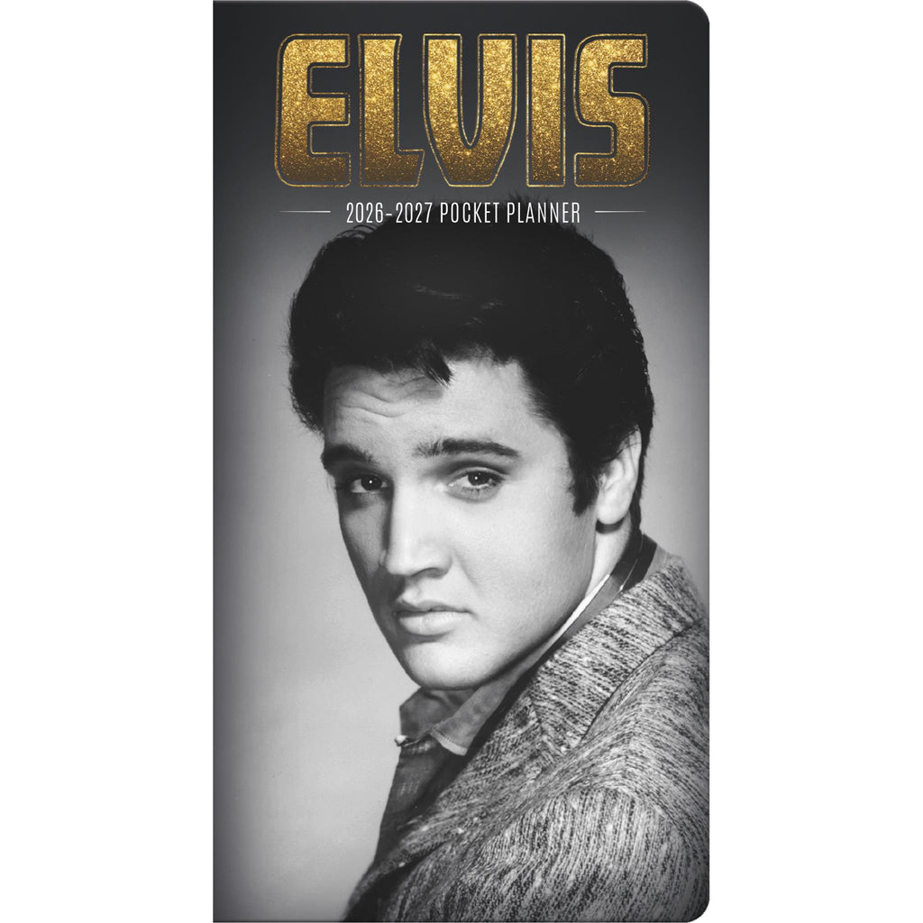 You can’t help falling in love all over again with the King of Rock and Roll in the 2026–2027 Elvis Presley Pocket Planner Calendar. Don’t be cruel by not using it to rock your way through the year. Two-year pocket planners feature monthly calendar spreads for August 2025 to December 2027. Each page highlights federal holidays and moon phases, with daily blocks for jotting down tasks and appointments. Extra notes pages are included to help you stay organized. Compact, portable, travel-size planner is the perfect size for your purse, pocket or backpack. Includes a durable, eco-friendly, plastic-free cover.