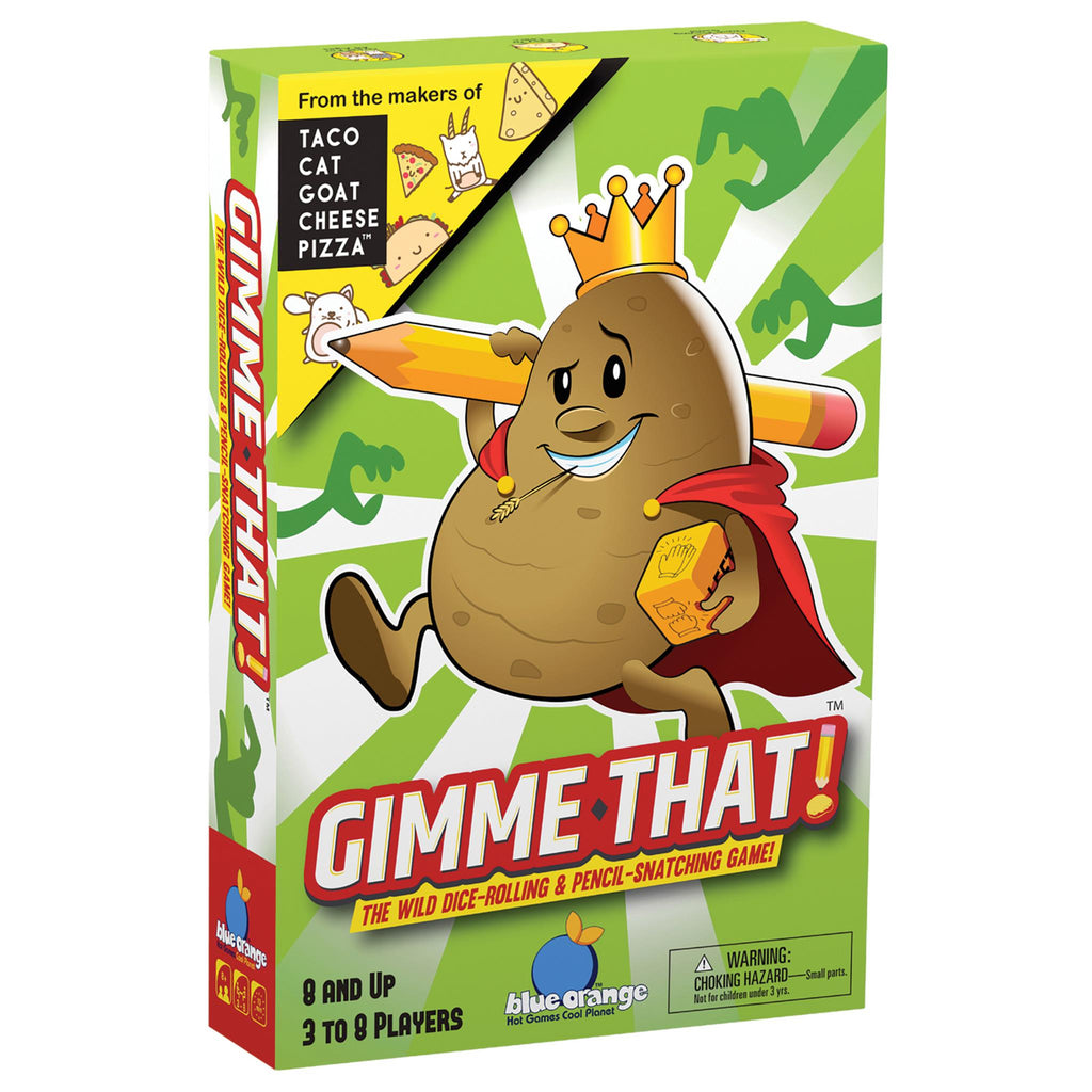 From the makers of Taco Cat Goat Cheese Pizza… introducing Gimme That, the wild potato mashing, high frying, pencil grabbing party game. As a new recruit for the Bureau of Spud Management, your assignment is counting potatoes. But – watch out! Everyone else has the same job and there’s only one pencil. Will you be the next Spud King?