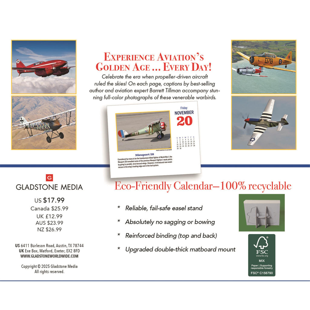The Golden Age of Flight desk calendar for 2026 showcases propeller-driven aircraft, from the fabric-and-wood biplanes and triplanes of WWI to the aluminum-and-steel warbirds of WWII. Detailed captions by aviation export and author Barrett Tillman accompany a different featured aircraft every page. You don't have to be a pilot to appreciate the nostalgia evoked by these magnificent flying machines, whose gallant pilots headed off into the wild blue yonder.