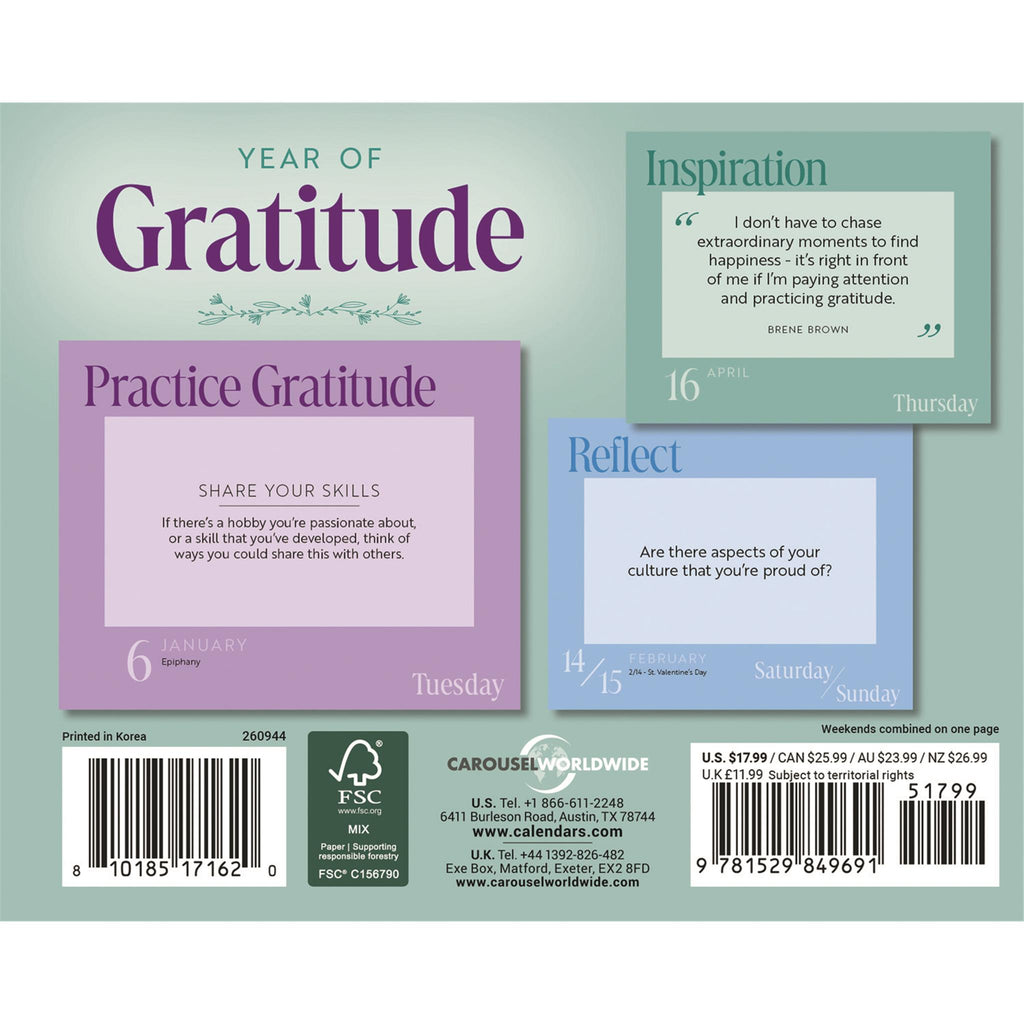 This 2026 Year of Gratitude box calendar features colorful, floral artwork paired with uplifting, positive sentiments that inspire you to give thanks for all you have each month. This calendar is free of plastic packaging.