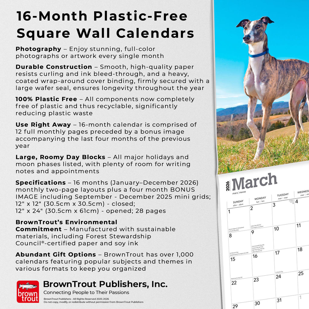 Presumably from Egypt, this breed dates back 5,000 years or more. The Greyhound is gentle, loving, affectionate—and incredibly fast. General George A. Custer fancied these graceful animals so much that he owned a pack of about 40 hounds. Those who admire the sleek, beautiful Greyhound will appreciate this magnificent calendar.