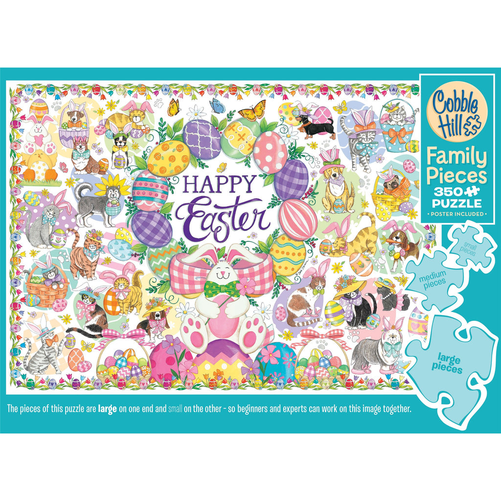 It's an egg-splosion of spring goodness! There is so much to discover - it's almost like an Easter egg hunt got packed into a puzzle box! This is a Family Pieces puzzle. On one side of the puzzle, the pieces are small - perfect for adults - on the other side of the puzzle the pieces are large - perfect for kids. This way puzzlers of all ages and skill levels can work together. Cobble Hill puzzles feature interesting random-shaped pieces, so no two pieces are alike. Includes a handy poster.
