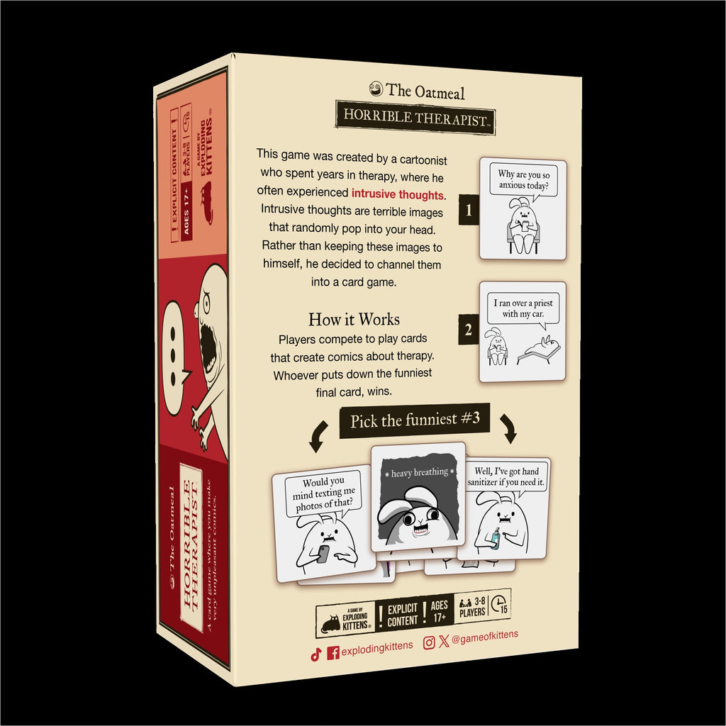 Horrible Therapist is a darkly funny adult party game from Exploding Kittens. A card game where you make very unpleasant comics. Designed for 3-8 players ages 17 and up, it challenges players to create ridiculous therapy sessions by combining Question, Answer, and Treatment cards to form absurd three-panel comic scenarios. With over 400 cards, every round delivers unpredictable and laugh-out-loud results as players explore the comedic chaos of bad advice and worse solutions. Easy to learn and endlessly replayable, Horrible Therapist is perfect for game nights with friends who enjoy edgy, offbeat humor. Each game lasts 15-60 minutes, making it ideal for casual gatherings or late-night laughs. Just be warned. It’s not for the faint of heart, but for those who love their comedy on the darker side.
