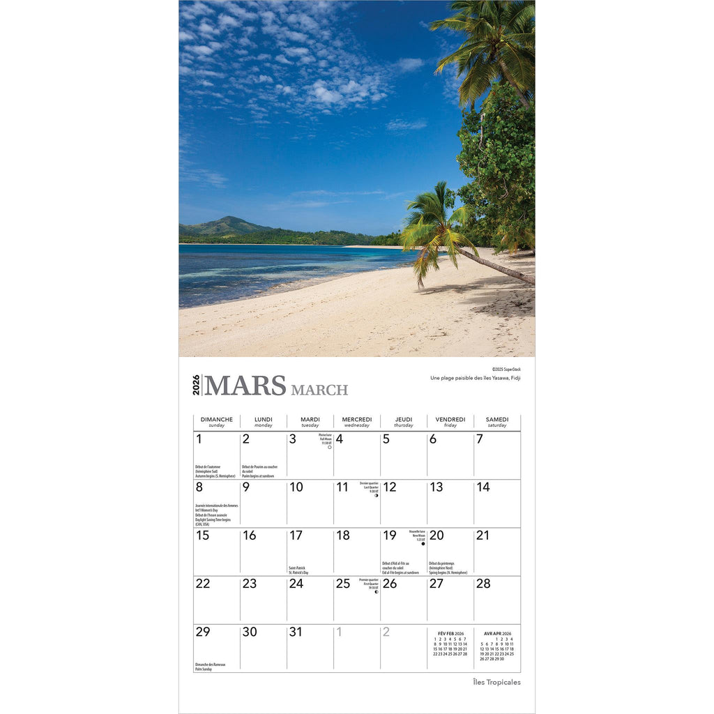 Les tropiques sont l'endroit idéal pour s'évader de tout. Laissez-vous ensorceler par l'air tropical embaumant et envelopper par la douceur et la chaleur de la brise. Imaginez le clapotis de l'océan au loin et laissez ce calendrier saturer vos sens avec des illustrations d'îles tropicales lointaines. Ce calendrier mini-mur est produit en français. - - - The world is bejeweled with enchanting island destinations. The golden sun, ivory sands, turquoise bays, and lush tropical forests of these welcoming island retreats are just waiting to be discovered and enjoyed. This calendar invites you to the turquoise water and soul-warming sunshine of tropical island paradises, revealing the breathtaking allure of islands around the world.