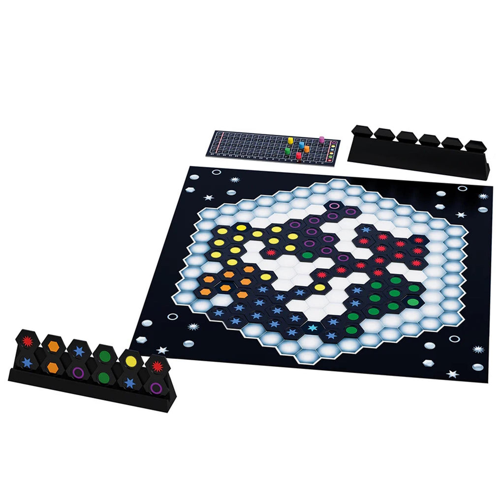 Think outside the square! Ingenious is an abstract tile-placement game in which the players take turns placing tiles in the shape of two connected hexagons into a hexagonal grid on the board. Each tile has two colored symbols on it. Players earn points in a specific color for each line of matching colored symbols that they extend when they place a tile. A player’s final score is determined by his or her lowest scoring color, not the highest. The winner is the player whose lowest score is the highest compared to the other players’ lowest scores, and not the player with the highest scoring color overall. Ingenious includes rules for solitaire and team play. This highly awarded, international bestseller has been redesigned with a plastic board.