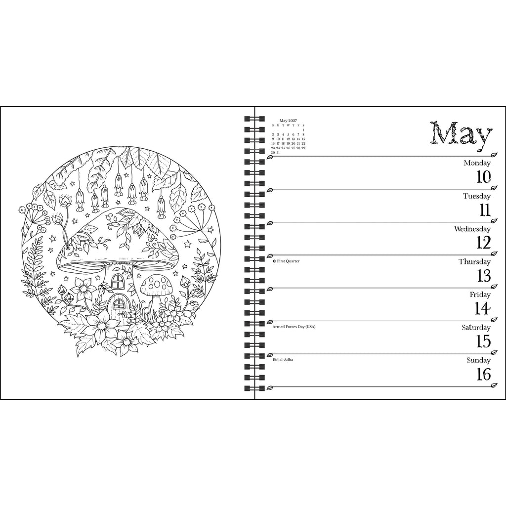 Step into a world of enchantment with this beautifully crafted planner featuring stunning artwork by Johanna Basford. Each weekly spread showcases mesmerizing illustrations and ornate line work, pulled from Basford's best-selling coloring books. Combining delicate florals, magical forests, and mythical dreamscapes, this planner transforms weekly tasks into a peaceful, imaginative escape. Allow yourself to slow down, find beauty in the details, and lose yourself in a world of beauty and wonder. Features include: 7 1/2" x 8 1/2" (15" x 8 1/2" open). Spiral bound. Gold-foil accented softcover. Calendar lays flat when open. Printed on FSC® certified paper with soy-based ink. High-quality paper stock specially selected by the artist. Removable product info band. 12-month planner: January–December 2027. Generous grid space for notes, appointments, and reminders. Weekly spreads include beautifully illustrated artwork and plenty of room to write. Planning spread for 2028. Year-at-a-glance pages for 2026, 2027, and 2028. Extra pages at back for notes, goals, and more. Detailed illustrations from Johanna's best-selling books.