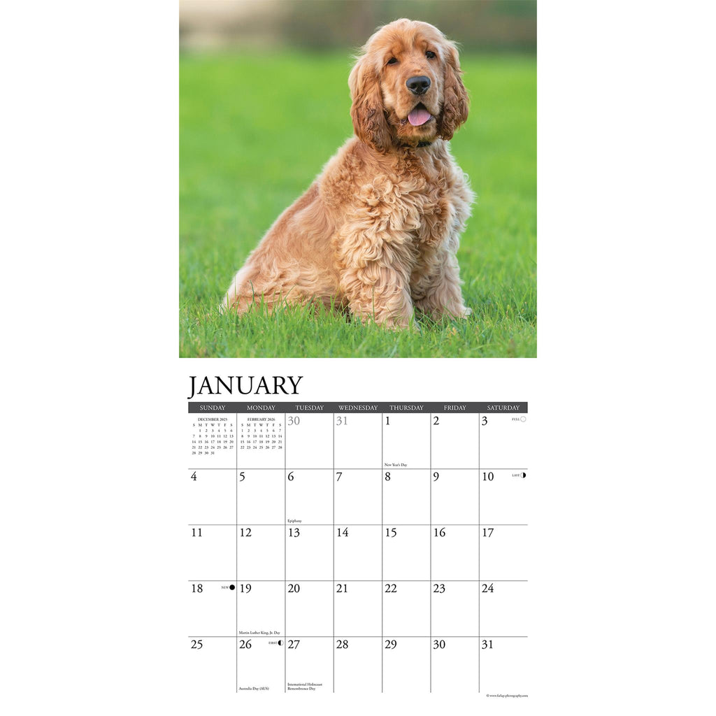 Cocker Spaniels are known for their sweet dispositions and charming demeanor. Twelve delightful photographs showcase all there is to love in these brown eyed, long eared charmers. Stay organized in the upcoming year with a Willow Creek Press 2026 12" x 12" Wall Calendar. This calendar features large grids for easy notation of dates and events, helping you stay efficient and on top of your commitments. Let this calendar guide you to a more organized, successful and fulfilled year ahead. PERFECT GIFT - Look no further for the perfect gift for any special occasion. Make someone's year extra special with one of our 2026 Wall Calendars. Our calendars are the perfect choice for your friends or family, even for those difficult to buy for. PLANNING - Stay organized and inspired throughout the year. Ideal calendar for taking notes, recording dates to remember, tracking appointments and assisting in family activity organization. INCREDIBLE IMAGES - Crisp, detailed full-color images every month providing Wall art for Home, Office or School. LARGE GRIDS - 12" x 12" format, with large daily blocks providing ample writing room. SUPERIOR QUALITY - High quality paper stock that lays flat when hanging and offers crisp, bright colors. MONTHLY OVERVIEW - Plan ahead or look back with grids of the upcoming and previous months at a glance. ECO FRIENDLY - Willow Creek Press is committed to eco-friendly efforts to make our products more sustainable, our 2026 12" x 12" wall calendars are printed with soy-based inks on high-quality FSC certified paper for smooth writing. DATE RANGE - 2026 Wall Calendar with 6 bonus months from July-December 2025. BONUS FEATURES -US and International holidays and moon phases (CST) noted on each month for easy tracking. This year can be your most successful yet, with this beautiful and brilliant wall calendar. Learn how to become a highly effective person, one month at a time!"