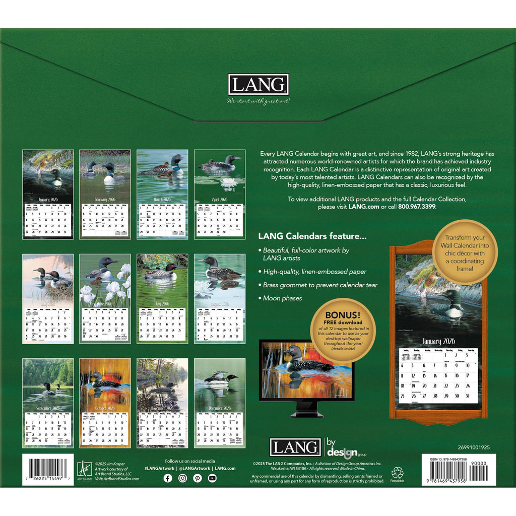 The Loons on the Lake 2026 Wall Calendar is decorated with monthly artwork by Jim Kasper of swimming loons . LANG Wall Calendars feature monthly full color images, elegant linen embossed paper stock, and a brass grommet for hanging. Desktop wallpaper download available.