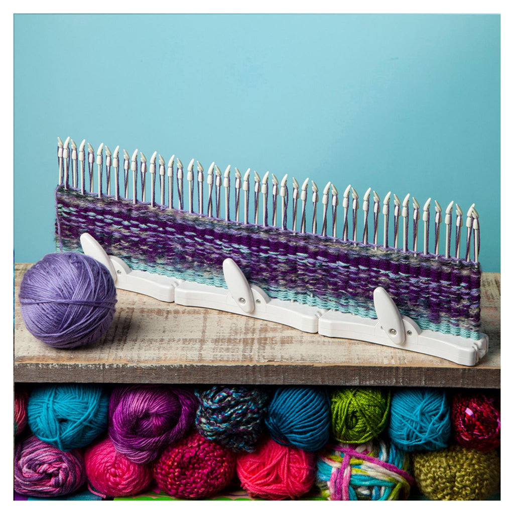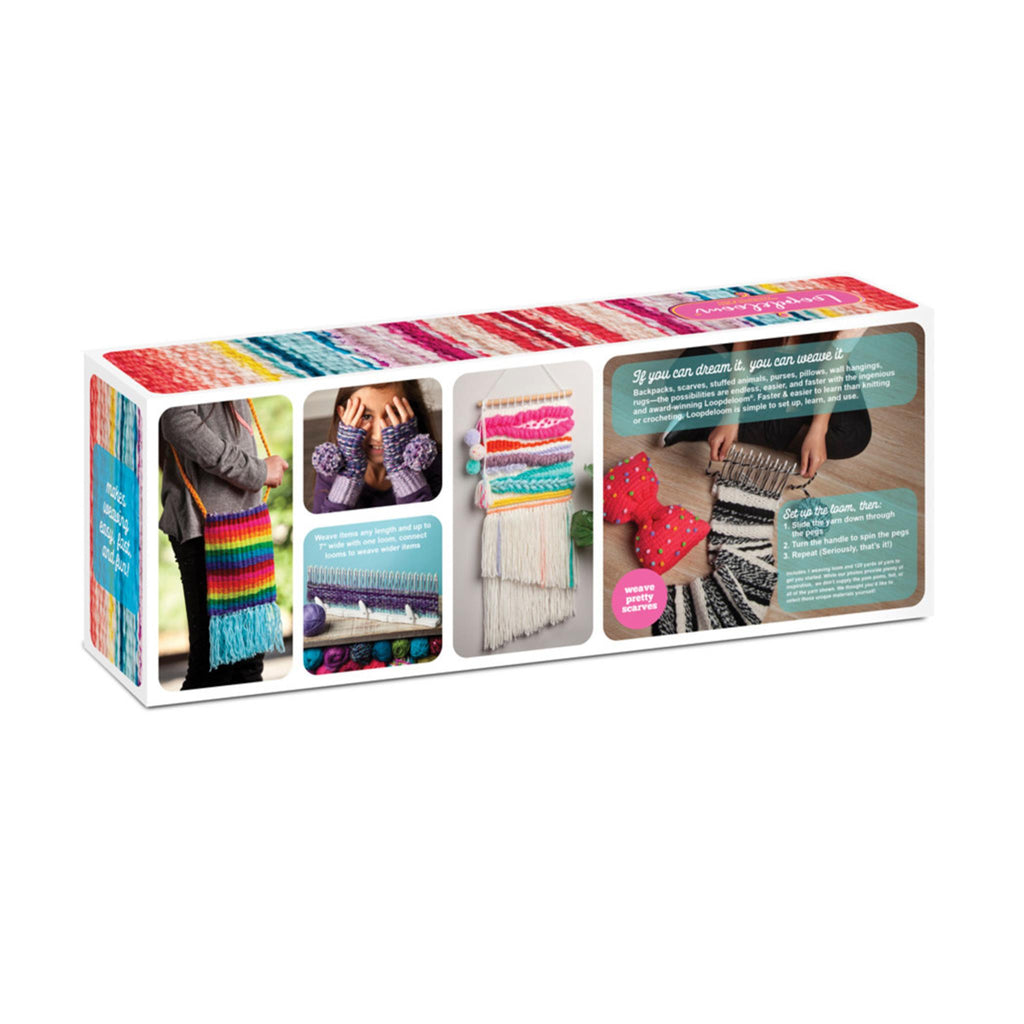 Weaving just got fast and fun! Loopdeloom is an ingenious new loom design with spinning pegs that speeds up the weaving process and makes it super simple. The winner of multiple prestigious toy and craft awards, it's simple to set up, it's simple to use, and it's surprisingly fast. So many things you can create, so many beautiful possibilities. Make anything from small basic potholders to large complex items with intriguing patterns. Weave purses and cell phone cases, scarves, wraps, baskets, throws and more. You can weave items any length, and up to 7" wide using one loom. Connect two or more looms together to weave wider items with no seams - genius! Say goodbye to traditional looms, we're putting a new spin on weaving! Kit includes 1 spinning peg loom and 120 yards of yarn to get you started.