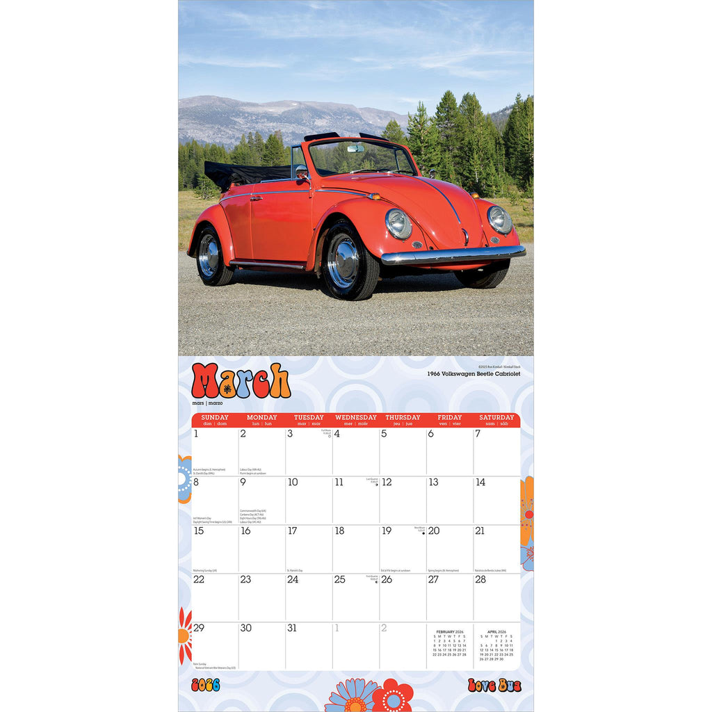 Take a trip down memory lane and explore the open road with these adorable, vintage bugs! Their compact size, rounded lines, and eye-like headlights have given these cute cars their endearing nickname. It's a blast from the past with the Love Bug calendar. So hop inside for a groovy joy ride and be prepared to fall in love all over again with this colorful and fun calendar.