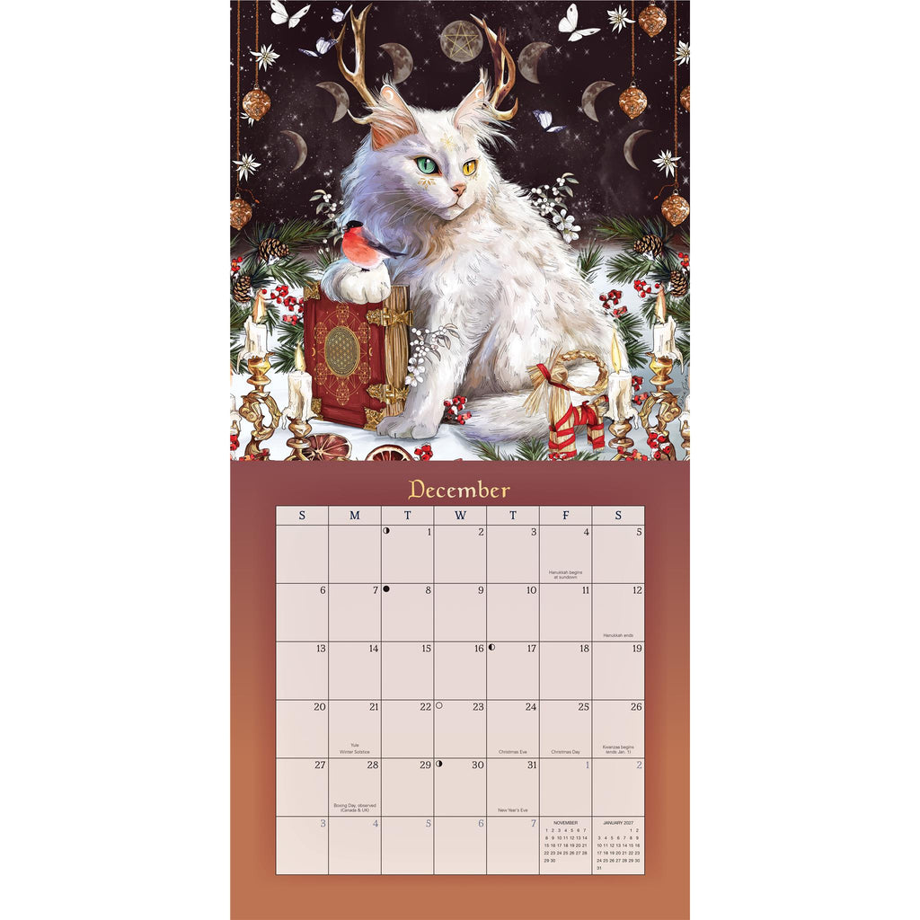 Fill Your Year with Formidable Feline Energy. Magic and mysticism meet in this paw-dorable wall calendar featuring a dozen colorful cat illustrations by SheBlackDragon. With a flick of a tail and a twitch of a whisker, the playful antics of these mischievous creatures are sure to bring a smile to your face while their wisdom keeps you motivated and organized throughout the year. Includes major US, UK, and Canadian holidays, Pagan holidays, eclipses, and moon phases.