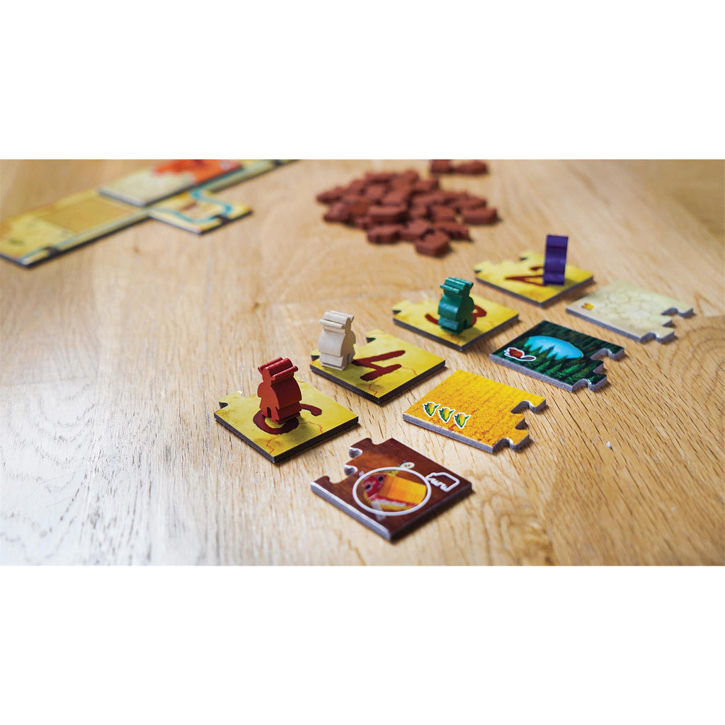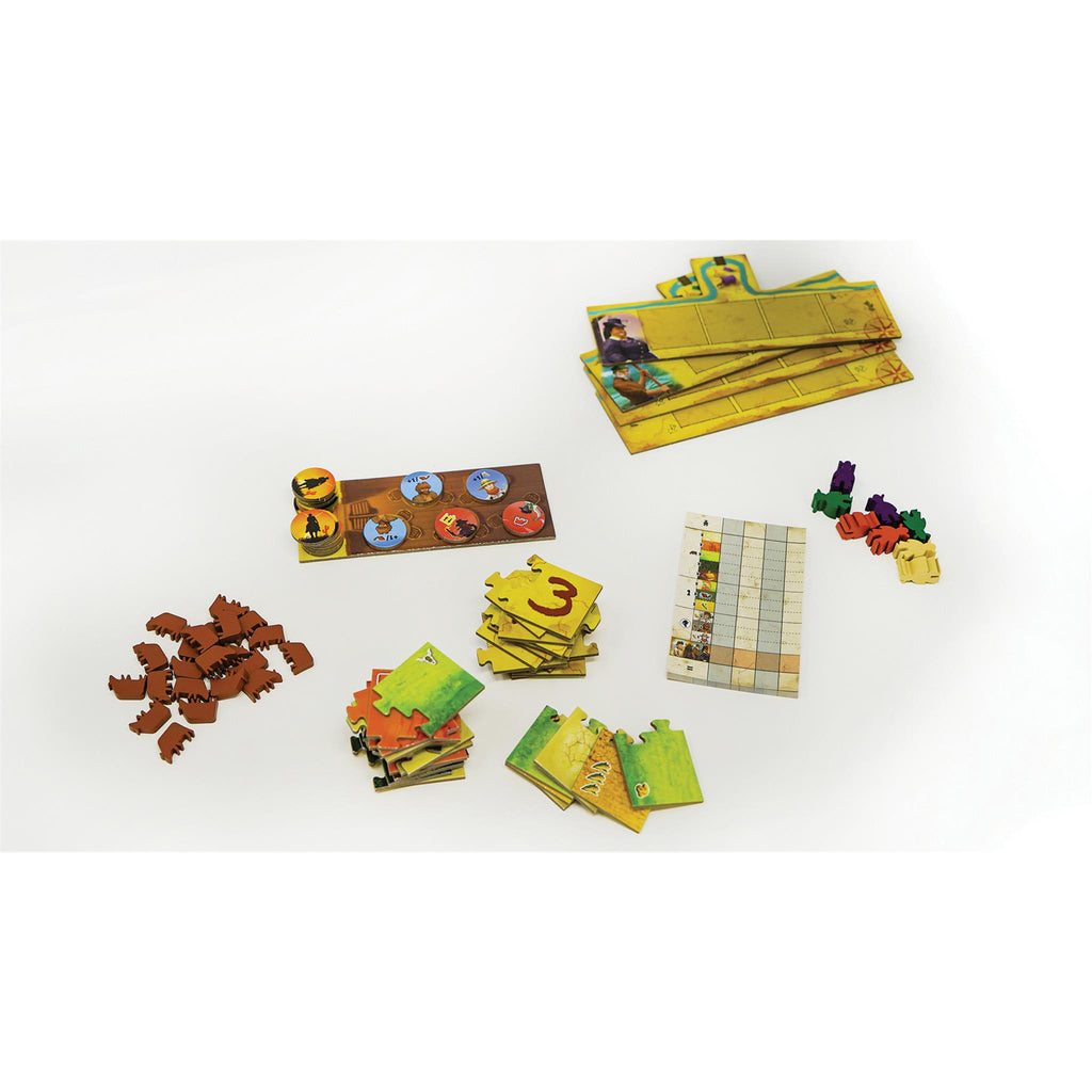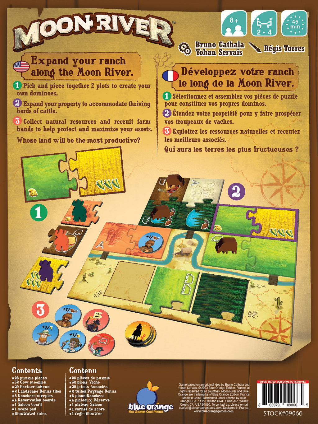 Moon River uses the Kingdomino game system - but without dominoes. Instead of building your landscape around a central castle, you start from the river and expand away from it. Corn fields, meadows, forests... you will need to explore these thoroughly to find the best plots, then exploit their precious resources and make your herds prosper. But the Wild West is ruthless! Beware of bandits, thieves and drought that could keep you from developing the most fruitful land.