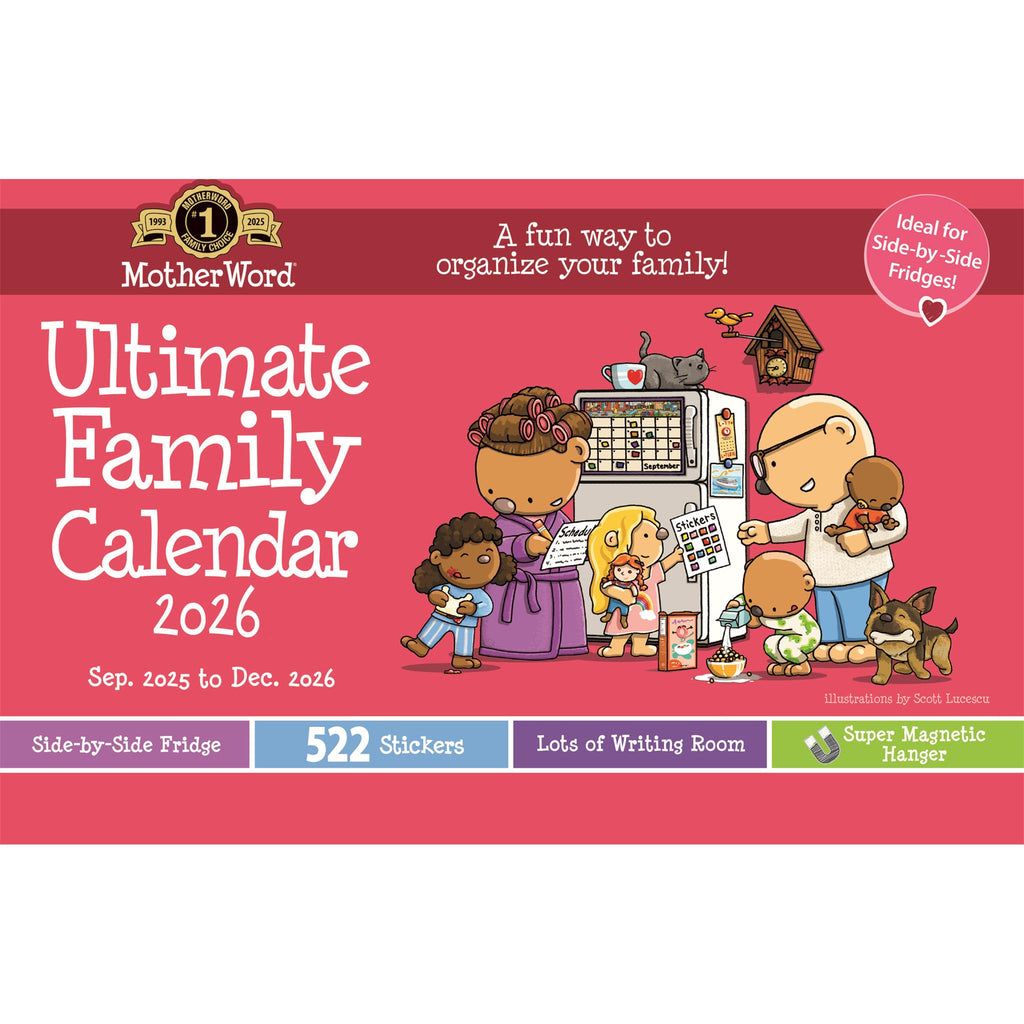Magnetic 16 month Fridge calendar helps to keep the busy family running smoothly. Lots of writing space to capture all the familys plans. Includes a strong magnetic bar, and 522 stickers to mark appointments, activities and events. English version.