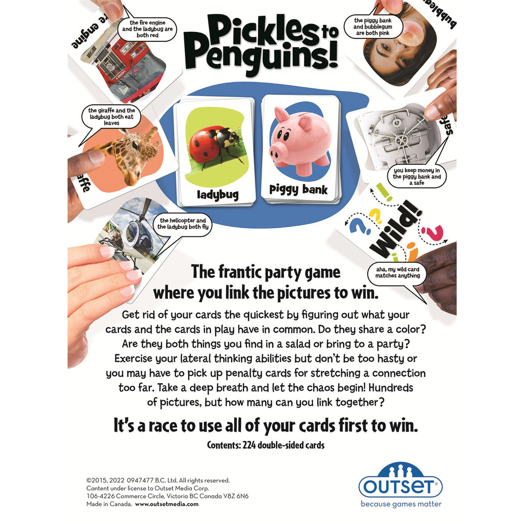 Get rid of your cards the quickest by figuring out what your cards and the cards in play have in common. Do they share a colour? Are they both things you find in a salad? Or bring to a party? It's a race to use all of your cards first to win. "Pickles to Penguins" is the quick-thinking picture-linking party game. Take a deep breath and let the action and chaos begin!