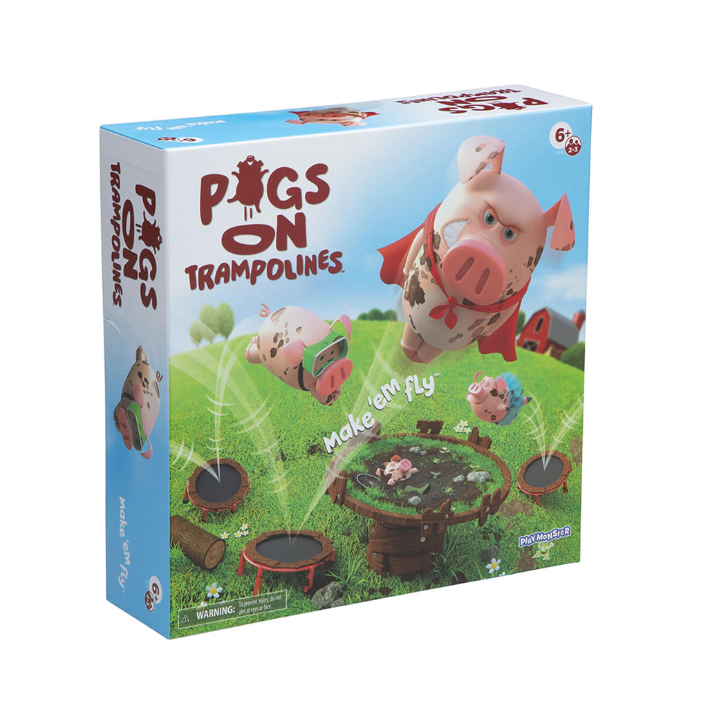 Yippeee! Jump for joy with Pigs on Trampolines! Use the trampolines to bounce your pigs into the pig pen and try to land in the mud puddle! Every pig you land in the puddle earns you a mud pie. Keep on bouncing your pigs until all the mud pies are gone—the muddiest piggy wins!?Comes with 6 rubber pigs, 3 trampolines, 7 mud pies, pig pen (some assembly required), and instructions. For 2 to 3 players, ages 6 and up!