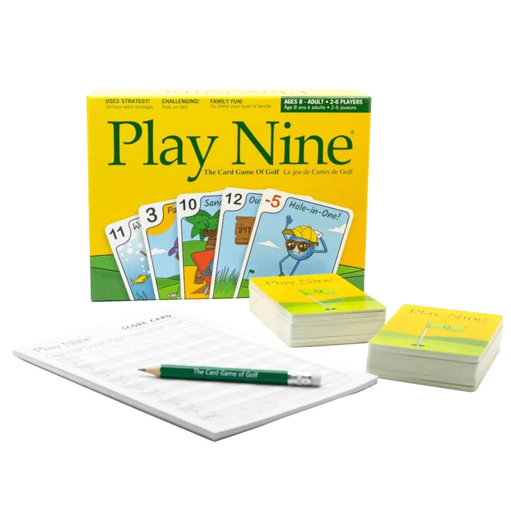 Play Nine Game. The object is to shoot the lowest score. After nine holes, the lowest score wins. Card values range from -5 (hole-in-one) to 12 (out of bounds). Golfers and non-golfers alike enjoy Play Nine. The game takes about 20 minutes to 1 hour to play depending on number of players. The combination of strategy and luck-of-the-draw keeps the fun and challenge alive down to the last hole. Play Nine, the card game of golf, is easy to learn and fun to play so - Let's Play Nine!
