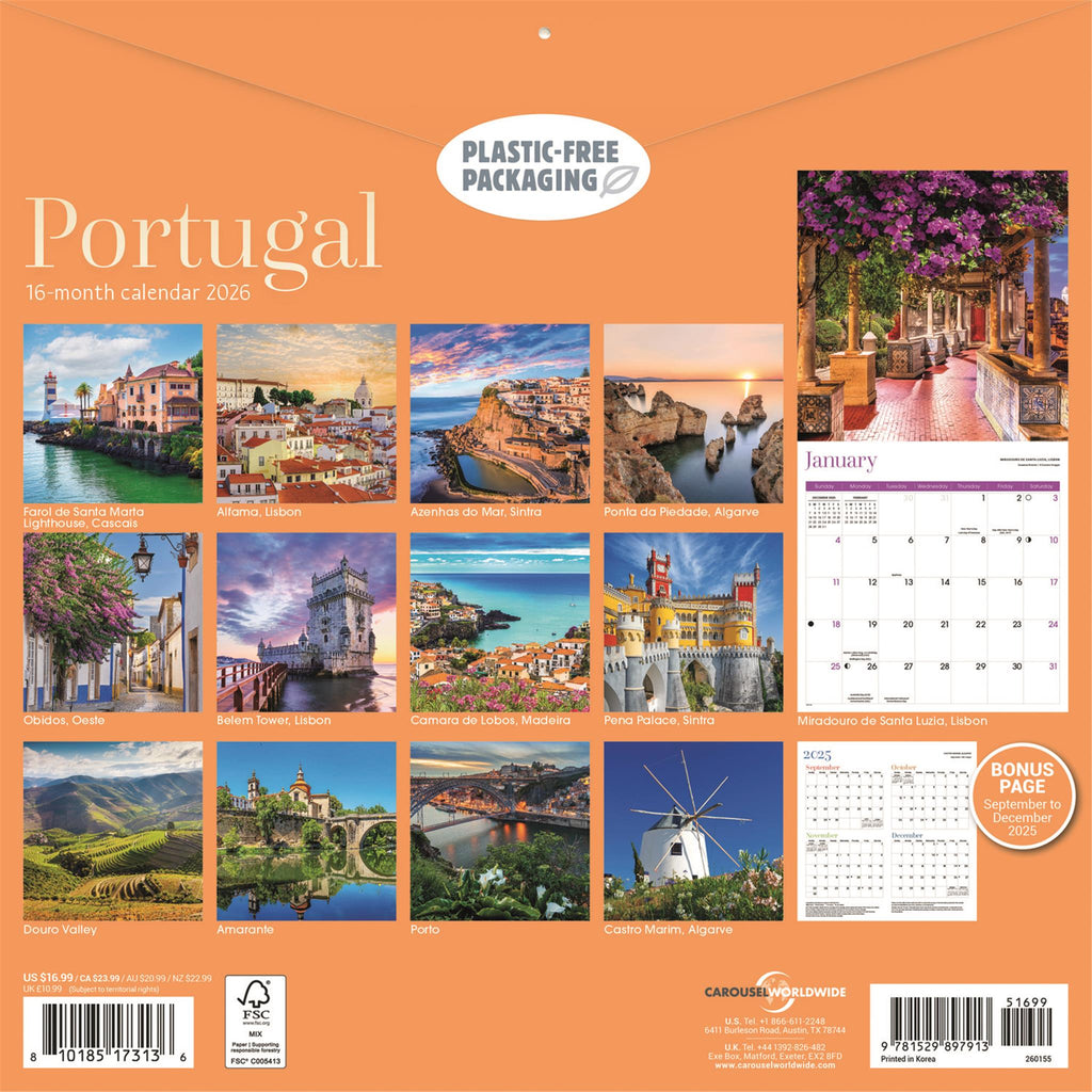The Portugal wall calendar for 2026 showcases some of the country's most beautiful locations. Each month has a stunning image of one of Portugal's most loved scenes. The spacious date grids offer plenty of space for your notes and appointments and the calendar is free of plastic packaging.