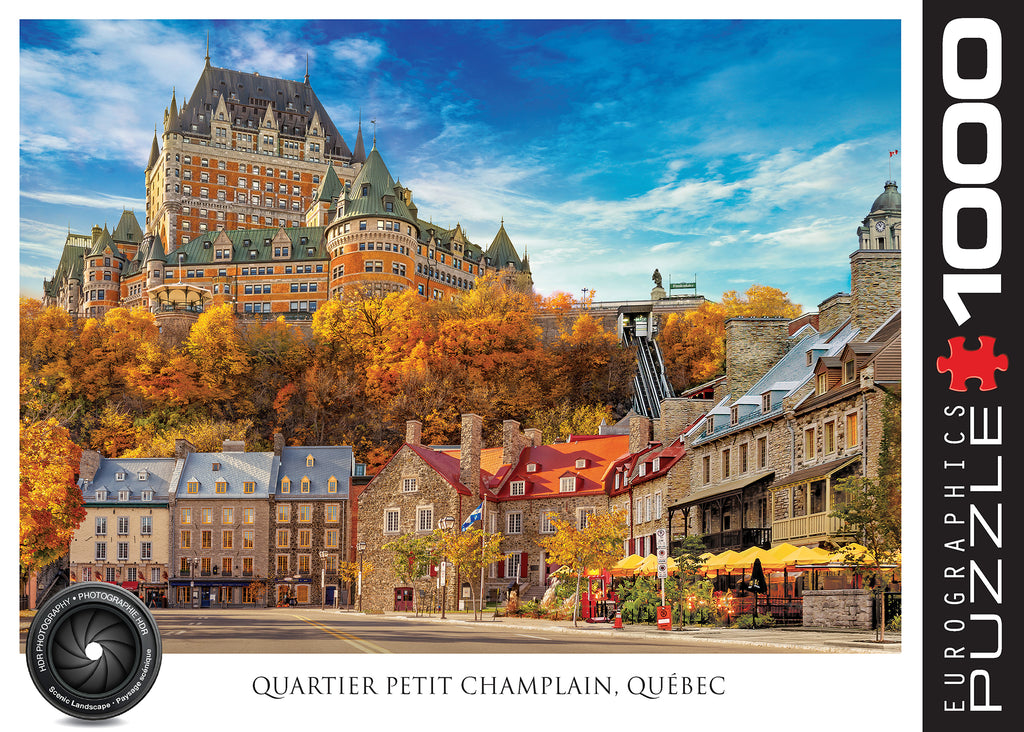 he Quartier du Petit Champlain is a small commercial area in Quebec City, Quebec, Canada. It is claimed that it's the oldest commercial district in North America. Strong high-quality puzzle pieces. Made in USA from recycled blue board paper and printed with vegetable based ink. Puzzle measures 19.25 x 26.6 inches completed.