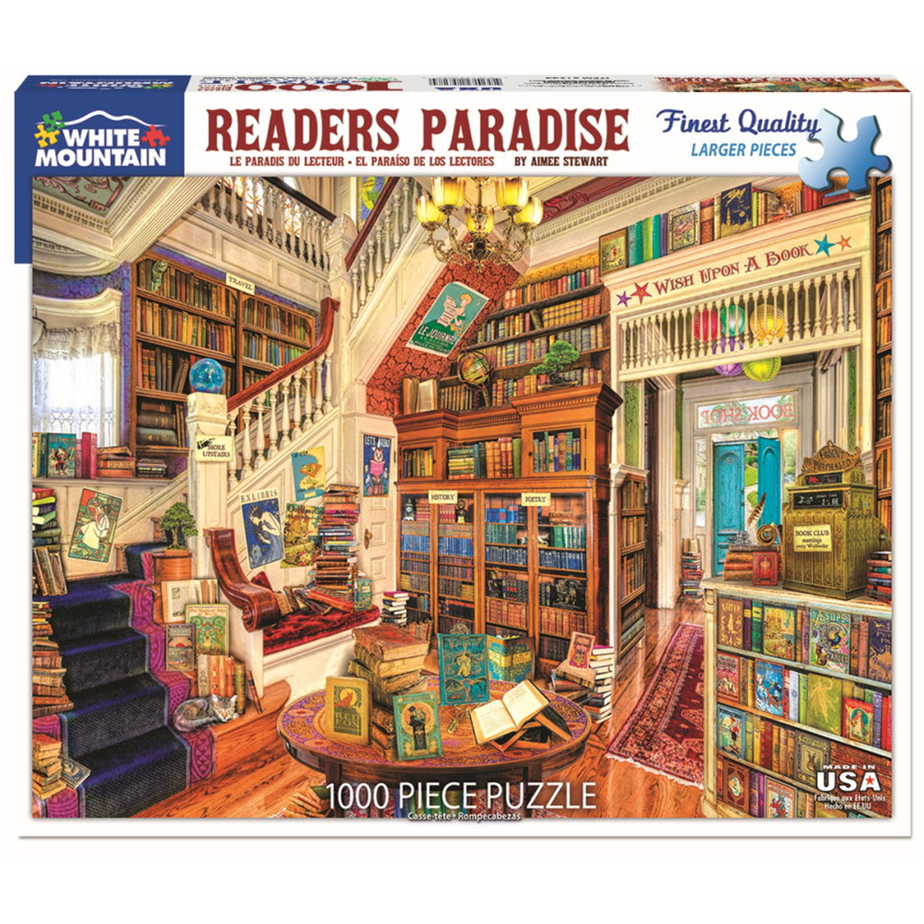 The amount of detail in this painting is astonishing! You'll be immediately drawn into this magical shop with stacks of tomes offering the classics, history, poetry, travel and much more. Find a cozy nook to settle into upstairs or downstairs and "wish upon a book". If you're lucky, the resident kitty might curl up on your lap. Artist Aimee Stewart. 1,000 pieces. Finished size 30" x 24".