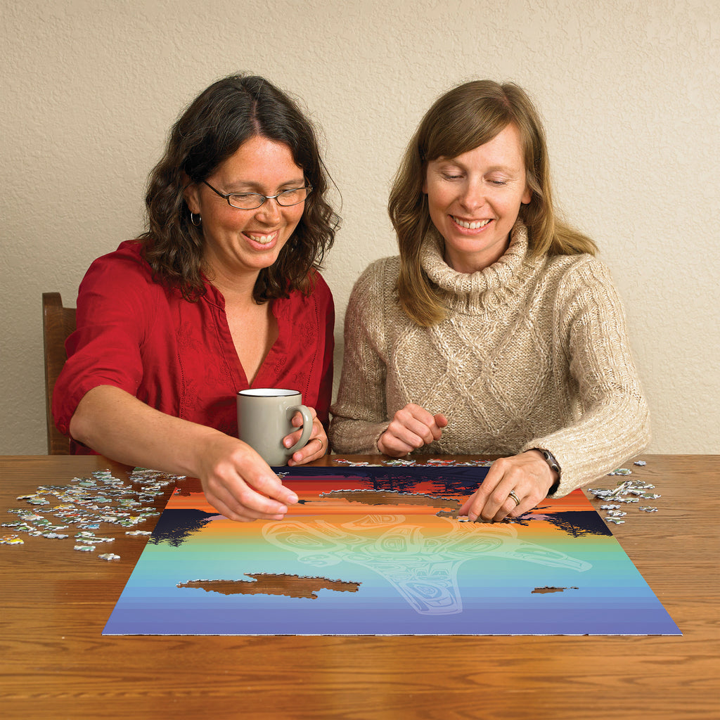 This strikingly beautiful 1,000 piece puzzle of Tristan Wolf's painting "Salish Coast Colours" brings the natural beauty of the Pacific Northwest to life. Two orcas silently navigate the waters off Vancouver Island in the setting sun. Beautiful colours, haunting silhouettes, and first nations imagery will make you truly appreciate the beauty of Mother Earth.