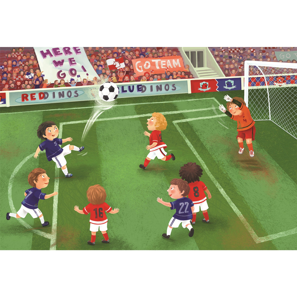 This 60-piece Eurographics puzzle, designed for ages 4+, is a fun way to bring the excitement of a soccer game to your home. The vibrant illustration depicts a lively match with players from the "RedDinos" and "BlueDinos" teams, as fans cheer them on from the stands. It's a great activity for developing problem-solving skills and hand-eye coordination.