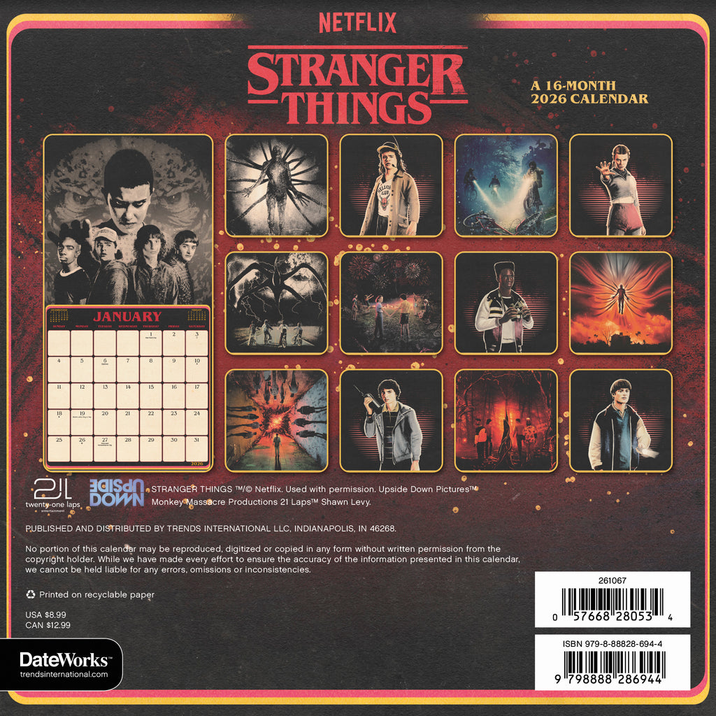 In 1980s Hawkins, Indiana, a group of friends witnesses strange supernatural occurrences, disappearances and secret government activities. Step into their world with images from the hit TV series in the 2026 Stranger Things Mini Calendar, perfectly sized to fit through the portal to the Upside Down. Ideal for limited wall space, 16-month mini calendars feature monthly pages for January to December 2026, as well as a page combining the last four months of 2025. Each monthly page includes federal holidays and moon phases, with daily blocks for jotting down tasks and appointments to help you stay organized. Features 13 high-quality images in a compact size, printed on premium paper certified by the Forest Stewardship Council. Perfect for hanging in school lockers, RVs or campers, small office cubicles and dorm rooms.