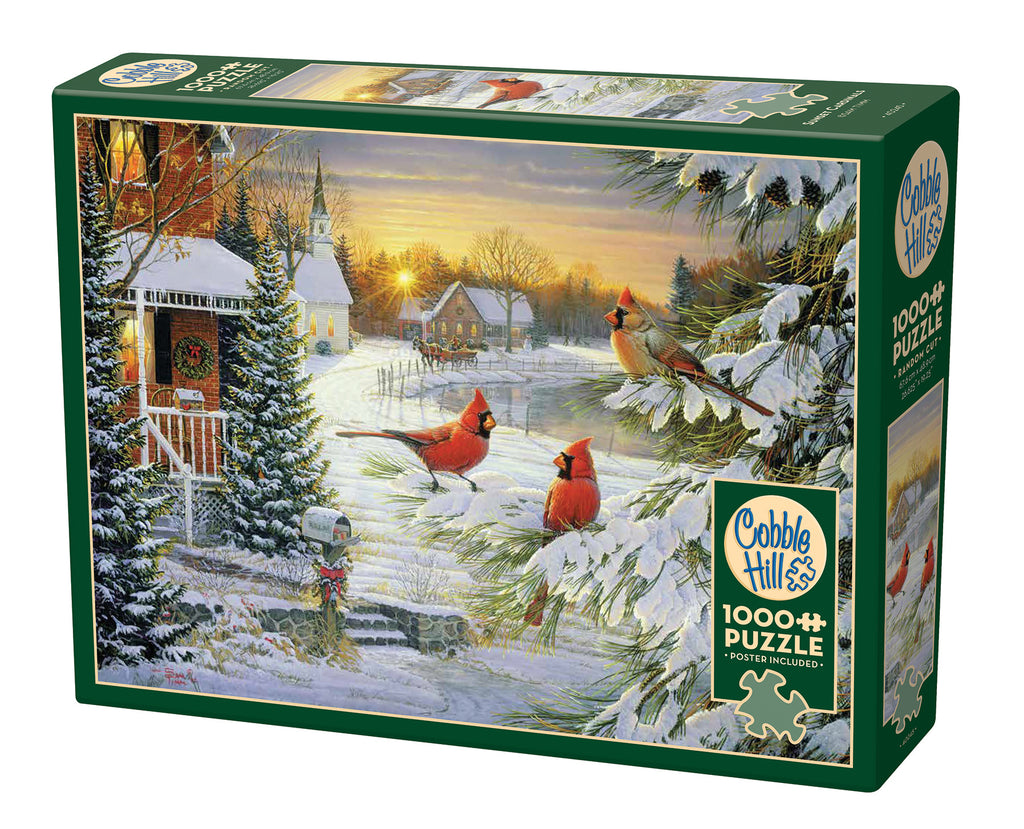 It's sunset at the country house, and the cardinals are meeting in the pine tree. This 1,000 piece puzzle is appropriately named "Sunset Cardinals". Cobble Hill puzzles feature interesting random-shaped pieces, so no two pieces are alike. Includes a handy poster.