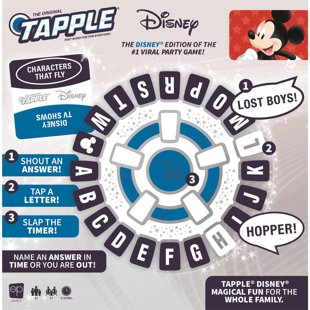 Show off your knowledge of the most enchanting world with TAPPLE: DISNEY Edition. Get ready to Shout, Tap, and Press your way to victory with the whole family! Pick a category like In Radiator Springs, Characters that Fly, or Disney's The Little Mermaid. Take turns tapping letters and shouting answers relating to the category like FFlounder, TThing-a-ma-bob, or JJetsom. But don't take more than 10 seconds to answer or the buzzer will get you! Play the 1 viral party game with a Disney twist! Comes with 36 double-sided cards featuring over 100 categories!
