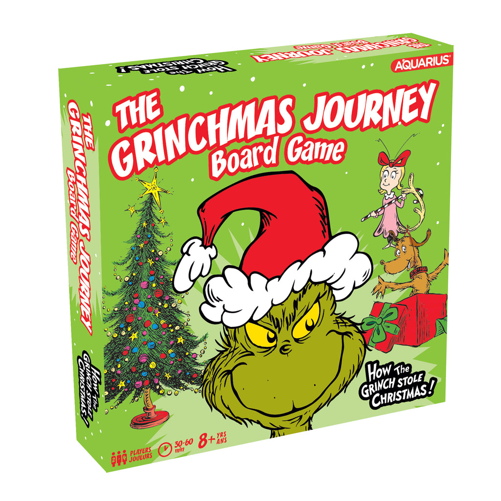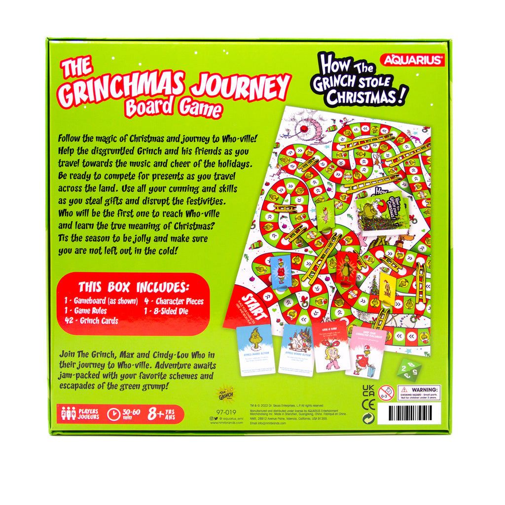 Enjoy this entertaining The Grinch board game with friends and family as you journey across this authentic The Grinch themed board game that's packed with imagery and inspired moments. COLLECT, MATCH AND OUTSTRATEGIZE your fellow friends with this incredibly fun Family board game which includes a game board, 4 character pieces, action cards and a die. For 2-4 players, ages 8 and up.