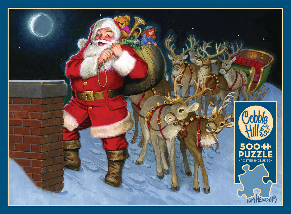 It must be Christmas! Santa Claus and his trusty reindeer have landed on the rooftop, and he's ready to head down the brick chimney with his bag full of toys for little girls and boys. The snowy roof is no concern for the reindeer, who will wait patiently under the moonlit sky. With the dark night sky and chimney, this 500 piece puzzle will be a challenge to assemble. Cobble Hill puzzles feature interesting random-shaped pieces, so no two pieces are alike. Includes a handy poster.