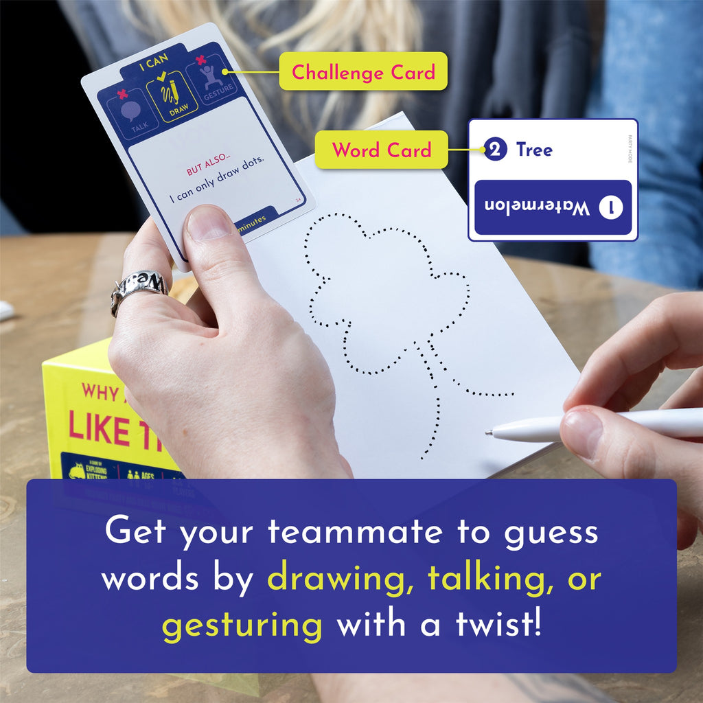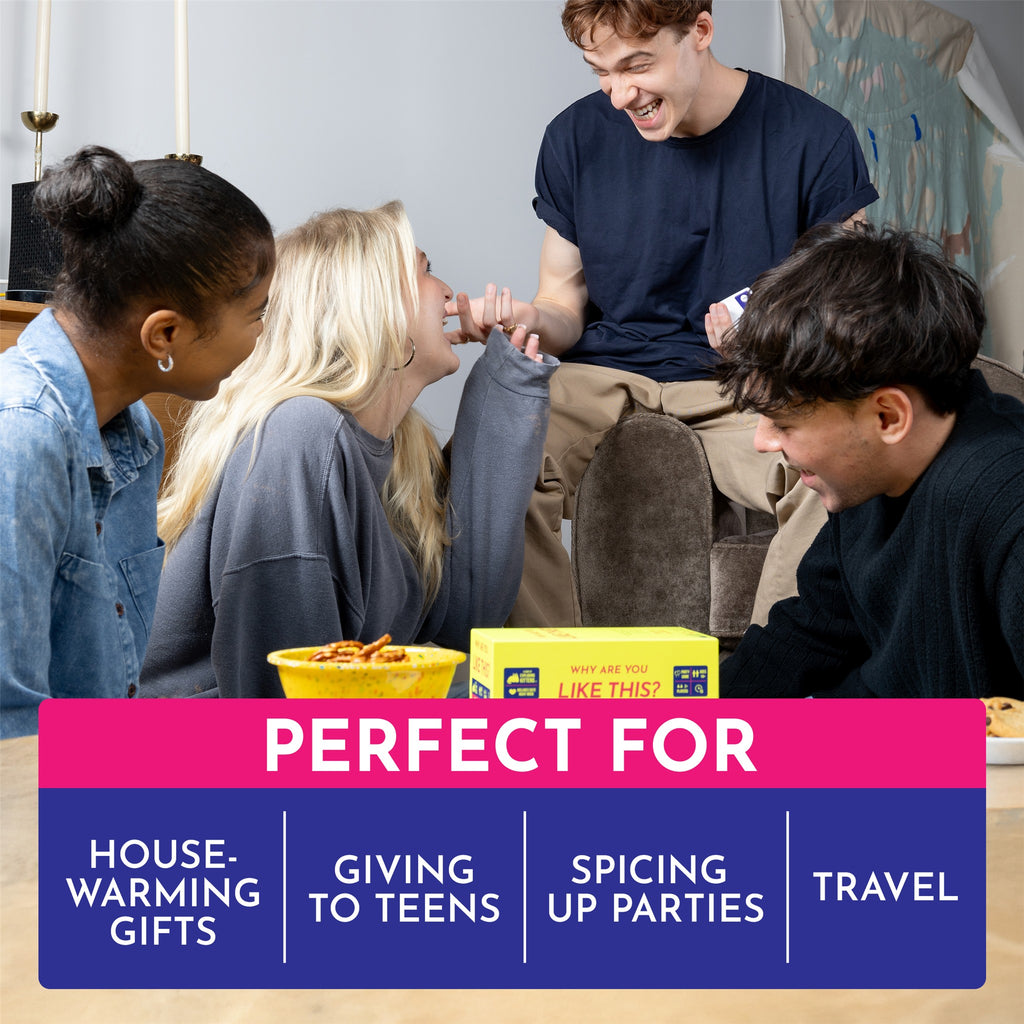 Get everyone talking, laughing, and guessing with Why Are You Like This? Party Edition! A card guessing game where you talk, draw, or gesture, this hilarious party game brings families and friends together for nonstop fun. Players take turns giving clues and acting out prompts while everyone races to guess the right answer. It’s fast-paced, funny, and full of silly moments that get everyone involved. Perfect for game nights, parties, and family gatherings, this family-friendly card game is easy to learn and perfect for players ages 7 and up. Whether you’re drawing, talking, or acting it out, you’ll be laughing and shouting, “Why are you like this?!” in no time!