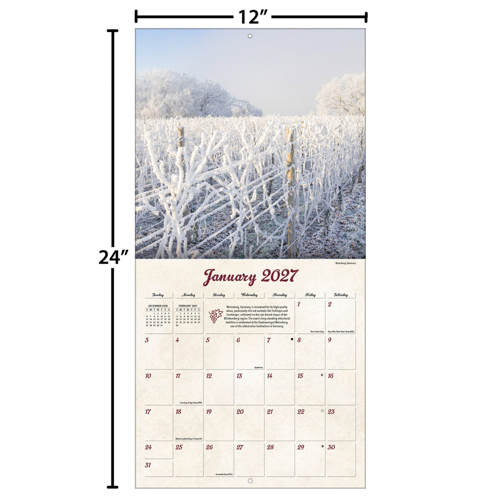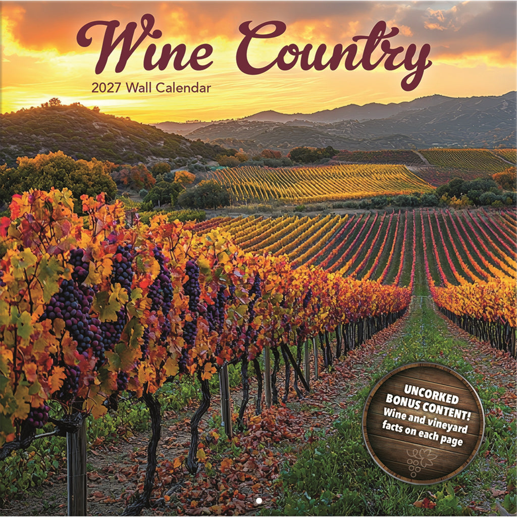 Dimensions (closed): 12"H x 12"WDimensions (open): 24"H x 12"WCalendar Format: Stapled with Medium Rectangle GridsCalendar Start Date: January 2027 Sunday Week StartTime Span: 12 month full page gridPaper Source: FSCInk Type: Soy-BasedPackaging: Plastic FreeCreative Artist: WINE COUNTRY Additional Features: