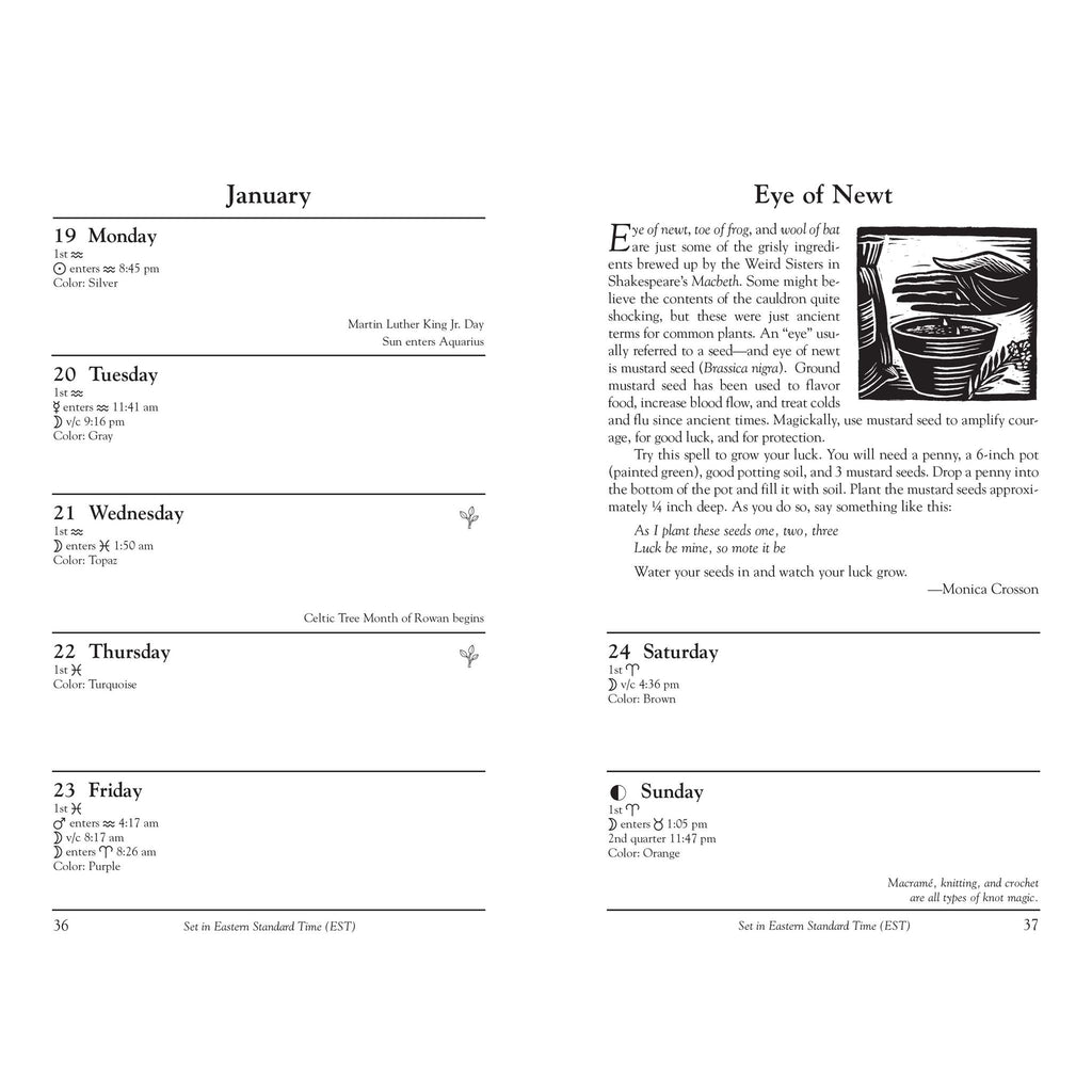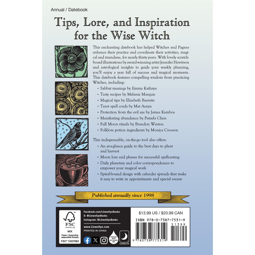 Embrace the Magic in Each Day with This Practical Organizer. Plan your way to success at home, at work, and in your spiritual practice with Llewellyns 2025 Witches Datebook. Featuring illustrations from award-winning artist Jennifer Hewitson, this popular datebook presents exciting ways to celebrate seasonal energies alongside wise words from esteemed Witches, such as: Sabbat musings by Diana Rajchel. Tasty recipes by Dawn Hunt. Magical tips by Elizabeth Barrette. Use of zodiac signs in magic by Ivo Dom“¡nguez, Jr.. Rabbit folklore in American regional Witchcraft by Via Hedera. Everyday weeds by Mhara Starling. Numerology through the year by Charlie Rainbow Wolf. Stealth tips for those in the broom closet by Jason Mankey. This indispensable, on-the-go tool also offers: An at-a-glance guide to the best days to plant and harvest, moon lore and phases for successful spellcasting, daily planetary and color correspondences to empower your magical work all included in this great spiral-bound design with calendar spreads that make it easy to write in appointments and special events. Published annually since 1998